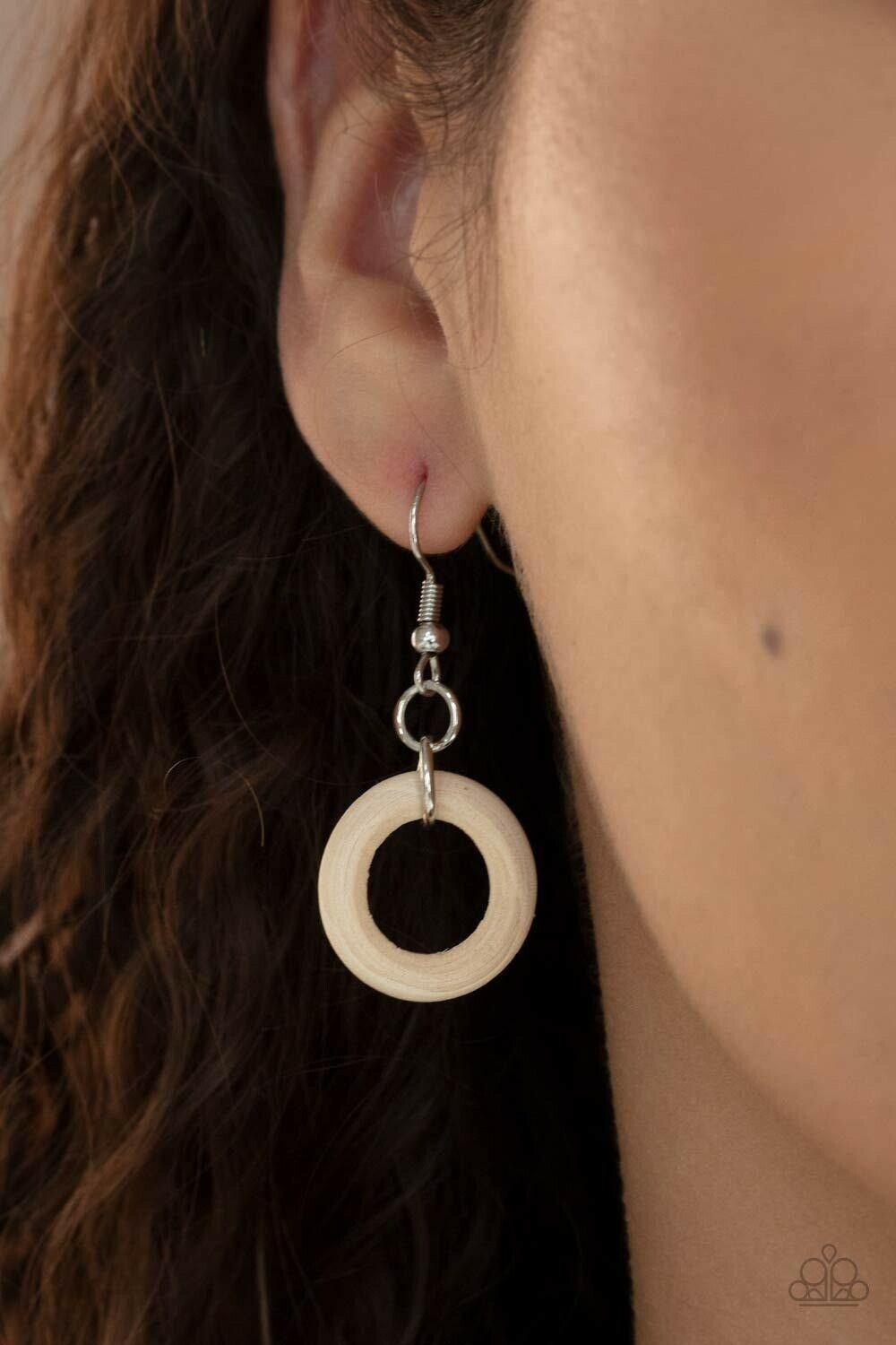Strands of brown yarn-like thread delicately weaves into a knotted macrame pattern at the bottom of a white wooden hoop. Dainty strands of brown suede knot around the pendant for an earthy flair. Features an adjustable clasp closure.