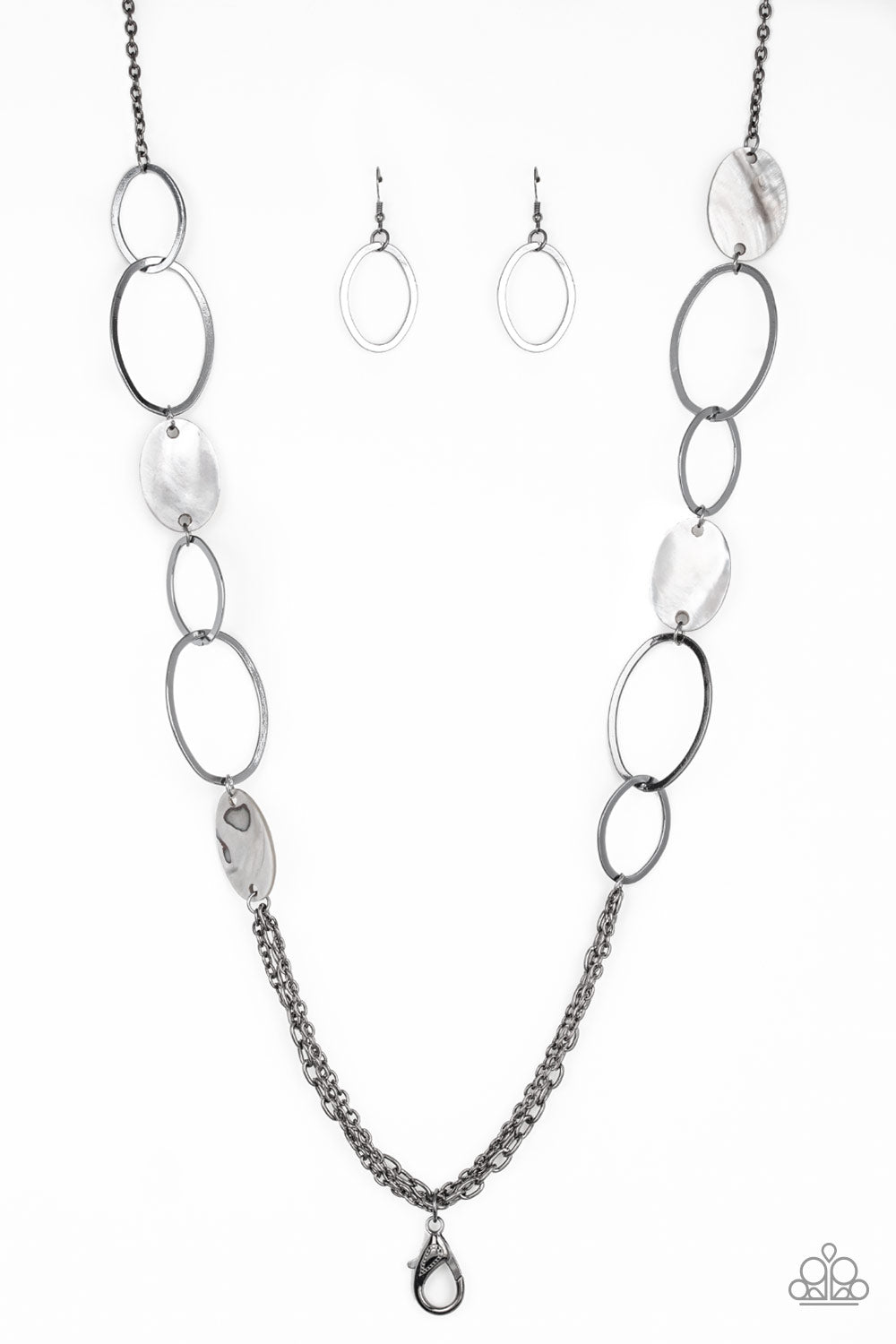 Brushed in a shell-like iridescence, a collection of flat oval beads and mismatched gunmetal hoops give way to layers of gunmetal chains down the chest for a whimsical look. A lobster clasp hangs from the bottom of the design to allow a name badge or other item to be attached. Features an adjustable clasp closure.