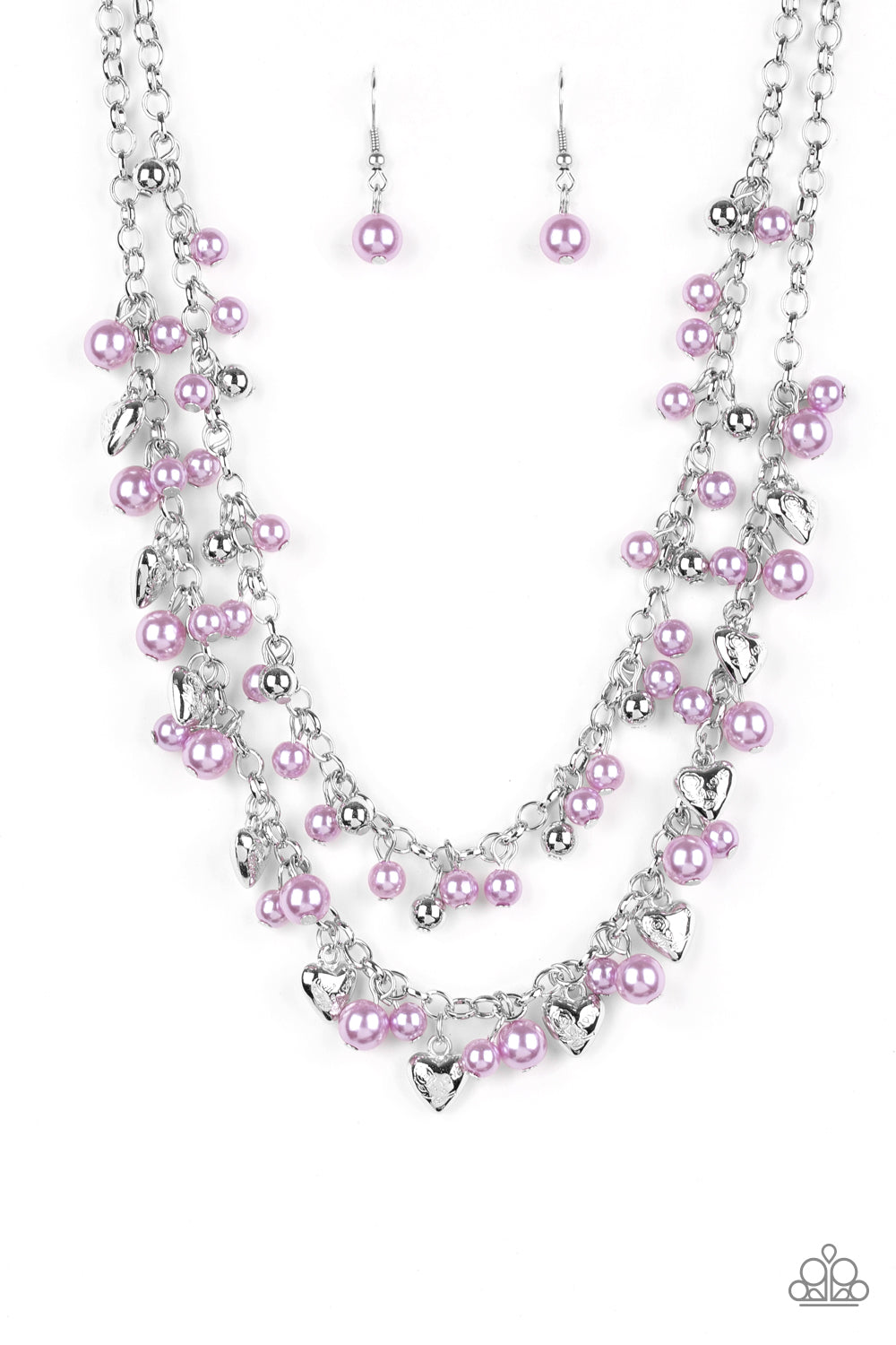 A collection of shiny silver beads and pearly purple beads cascade from the bottoms of two layered silver chains. Stamped in the word, "Love" floral heart charms dangle from the lowermost chain, creating a flirtatious fringe below the collar. Features an adjustable clasp closure.