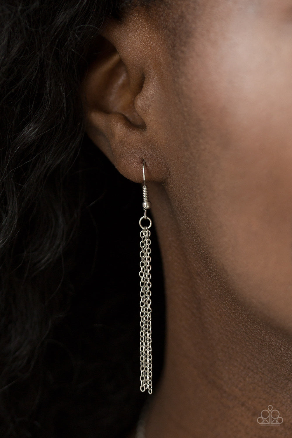 Dainty silver heart charms slide along two dainty silver chains below the collar, creating flirtatious layers. Features an adjustable clasp closure.