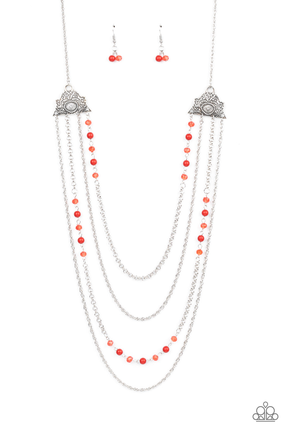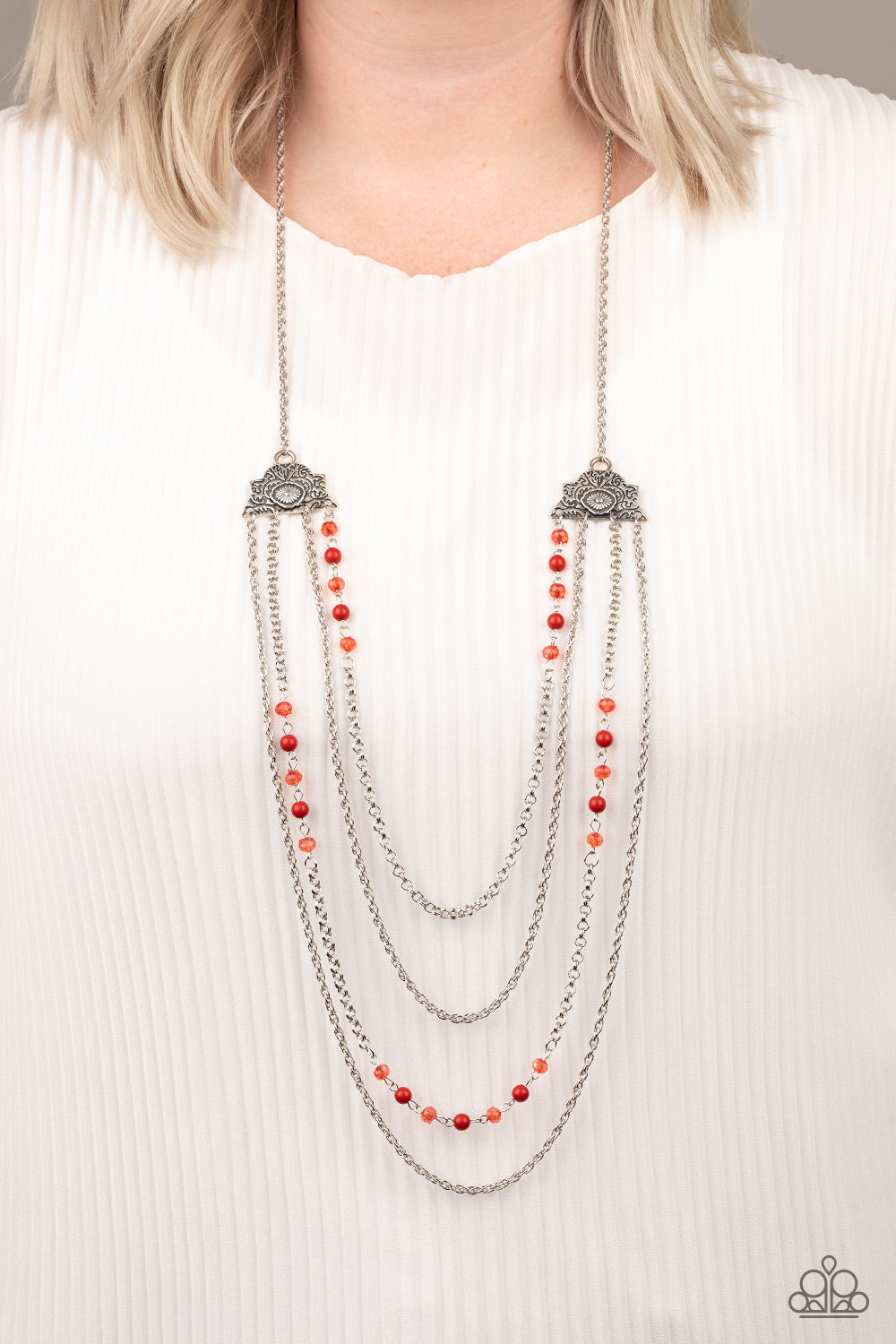 Attached to two ornate floral silver fittings, shimmery silver chains and strands of polished red and glassy crystal-like beads cascade across the chest for a whimsically layered look. Features an adjustable clasp closure.