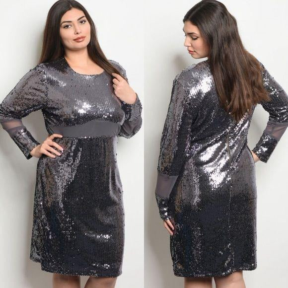 Brand new beautiful Charcoal Gray Sequin Dress with mesh retail on the sleeves, long sleeves and scoop neckline. Zips up in the back. This dress is perfect for a special event, date night or a party.
