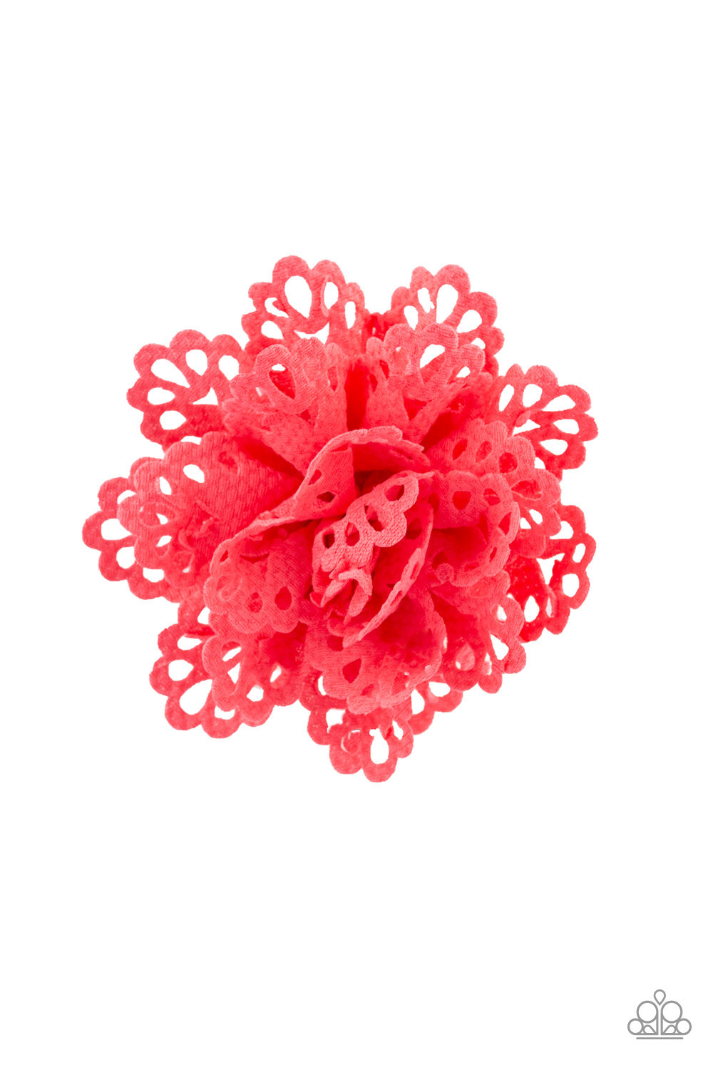 Featuring airy cutout patterns, refreshing coral petals gather into a billowy blossom for a springtime look. Features a standard hair clip on the back.