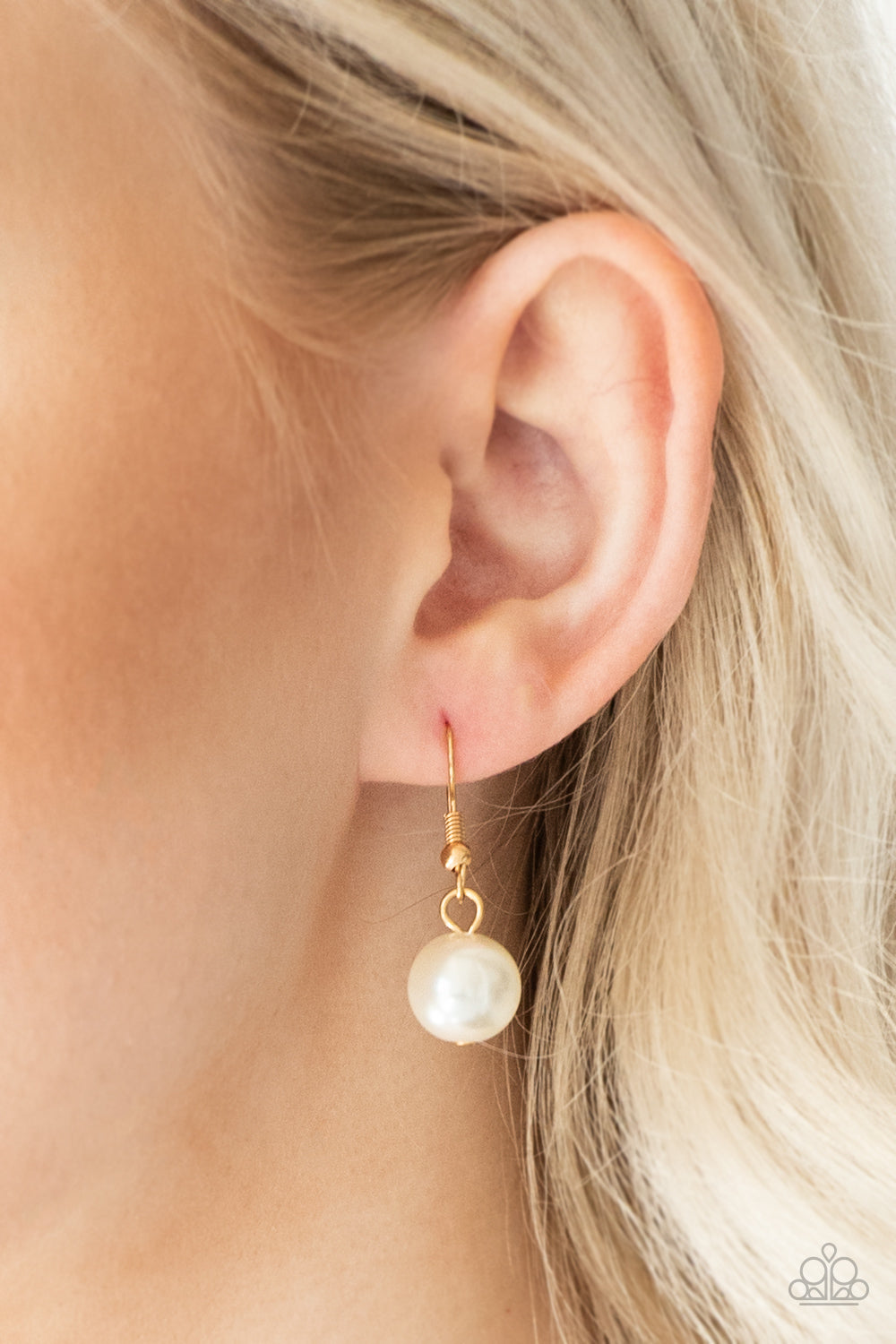 Oversized gold, crystal-like, and pearly white beads are threaded along an invisible wire below the collar for a glamorous look. White rhinestone encrusted rings are sprinkled between the dramatic beads for a sparkling finish. Features an adjustable clasp closure.