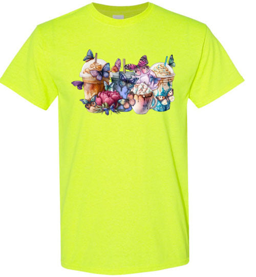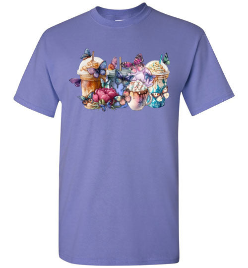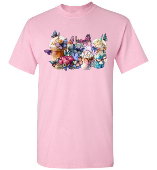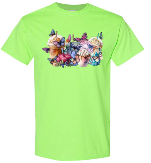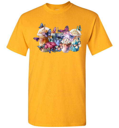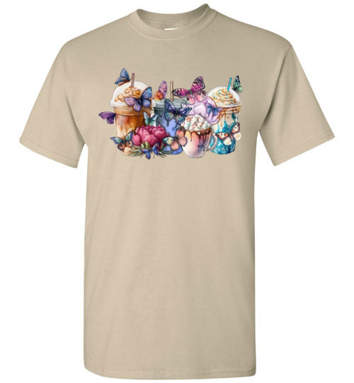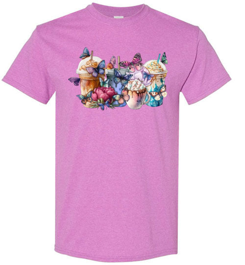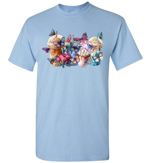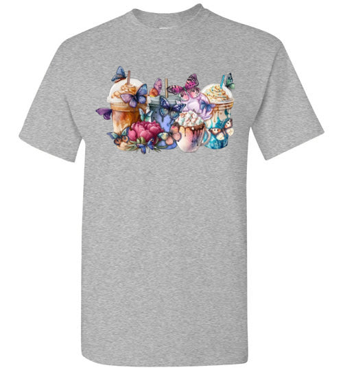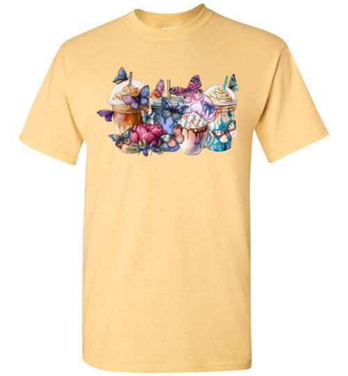 Whimsical Butterfly and Coffee Cups Graphic Tee Shirt Top T-Shirt
