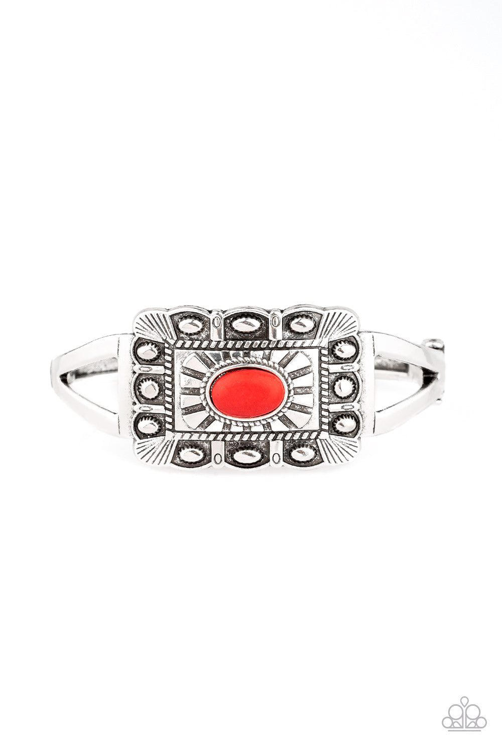 Embossed in sunburst patterns, a rectangular silver frame sits atop a bangle-like cuff for a seasonal flair. A fiery red stone is pressed into the center for a colorful finish. Features a hinged closure.
