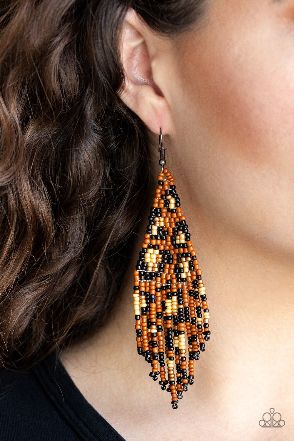 Featuring black, brown and golden seed beads, dainty beaded tassels swing from the bottom of a beaded triangular frame for a tribal inspired look. Earring attaches to a standard fishhook fitting.