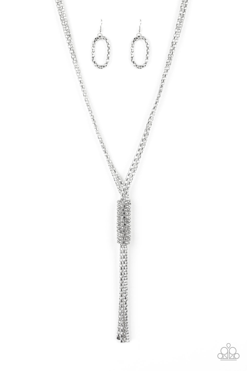 Shimmery strands of silver popcorn chain dramatically fall down the chest. An additional chain wraps around the cascading strands, creating a bold central pendant with shimmering tassels.