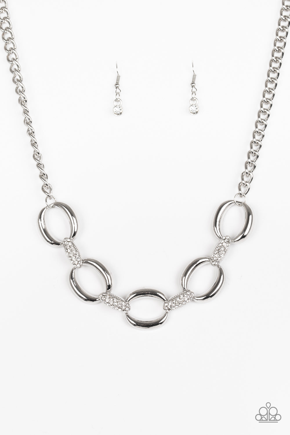 Bold silver links join with white rhinestone encrusted frames below the collar for a fierce look. Features an adjustable clasp closure.