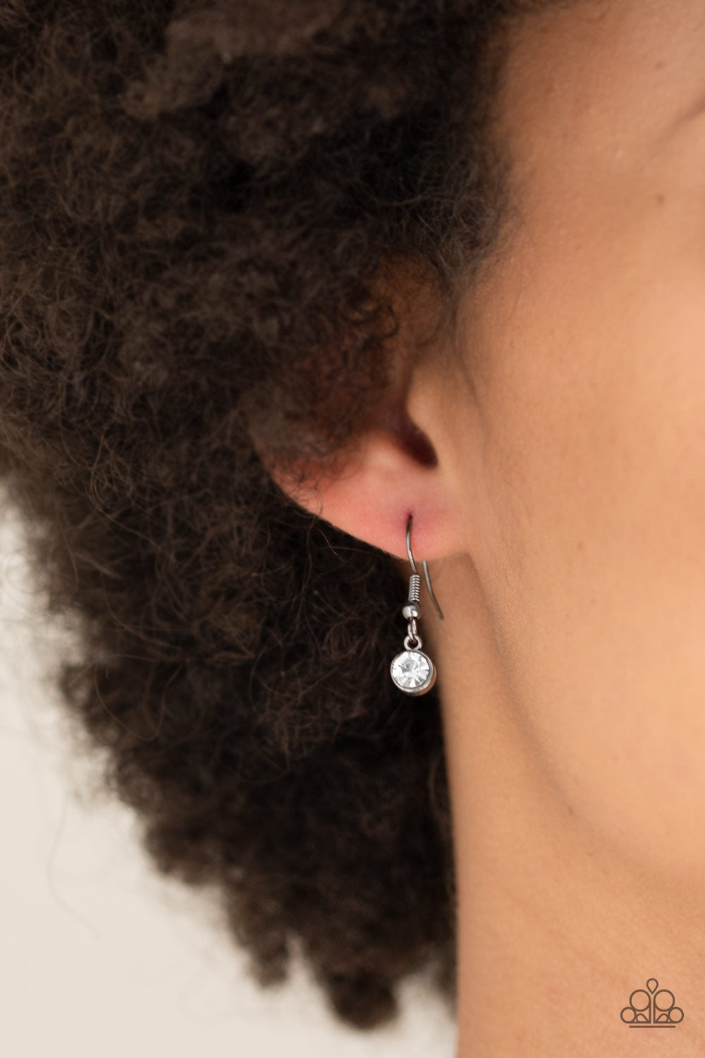 Encrusted in glittery white rhinestones, a dramatic gunmetal hoop swings from the bottom of a lengthened gunmetal chain for a refined look. A lobster clasp hangs from the bottom of the design to allow a name badge or other item to be attached. Features an adjustable clasp closure.