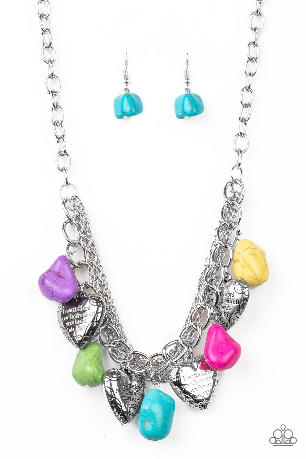 Multicolored faux rocks alternate with heart charms along a chunky silver chain. Hearts are inscribed with the phrase "With All My Heart" on one side and a short bible verse on the other that reads, "Love the Lord thy God with all your heart. Luke 10:27." Layers of various chains add some edge. Features an adjustable clasp closure.