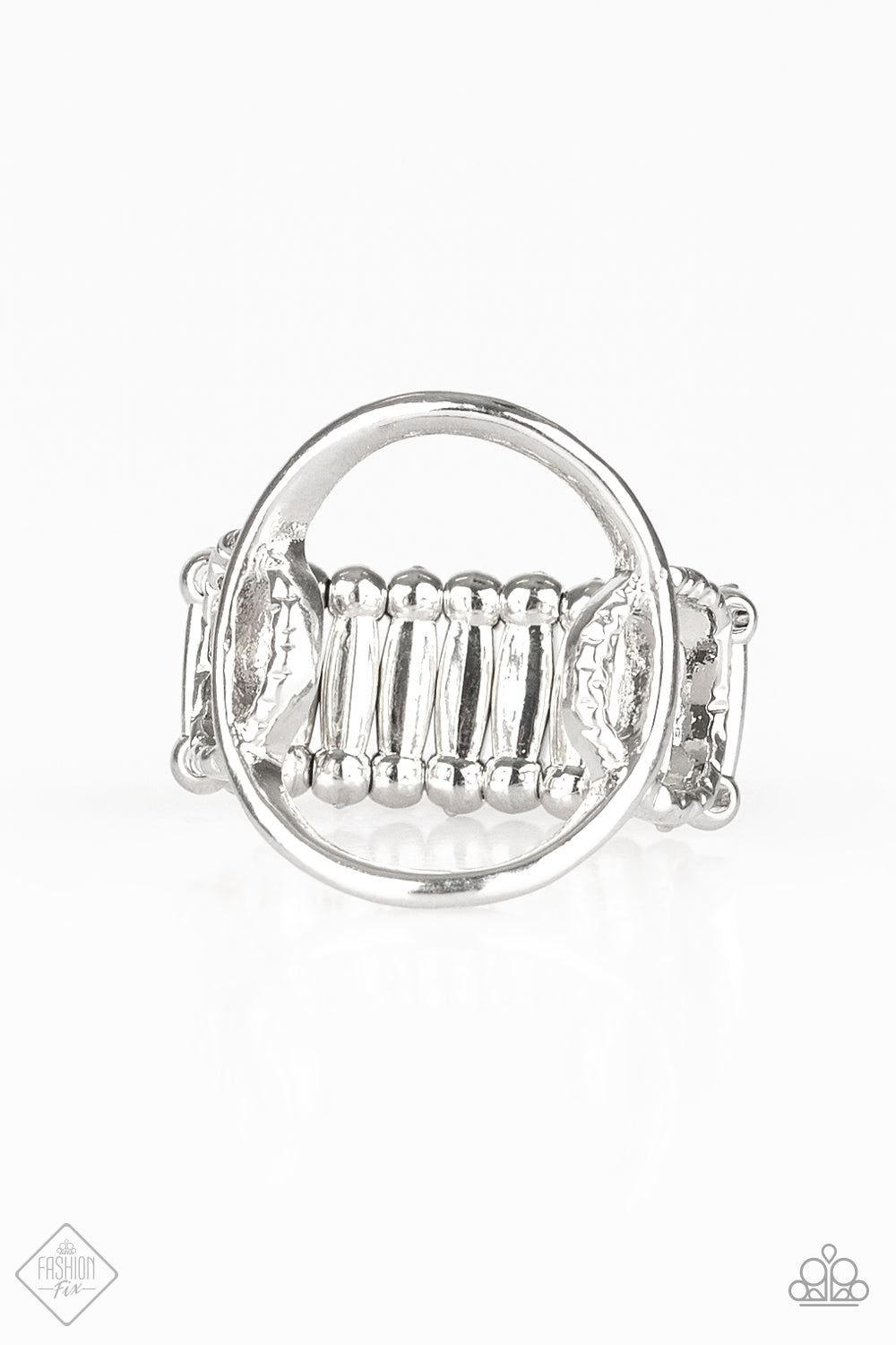 A shimmery silver hoop sits atop two textured silver rings, coalescing into an airy band. Features a stretchy band for a flexible fit.