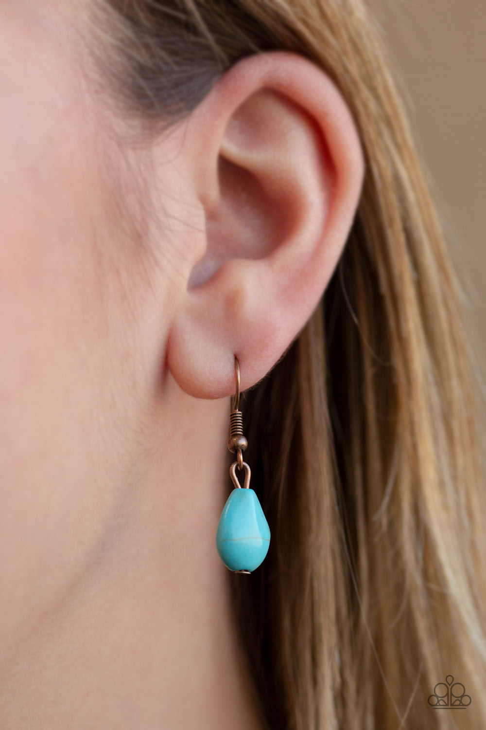 A dramatic turquoise stone teardrop is pressed into a glistening copper frame radiating with rustic patterns. The impressive pendant swings from the bottom of a lengthened copper chain for a seasonal look. Features an adjustable clasp closure.