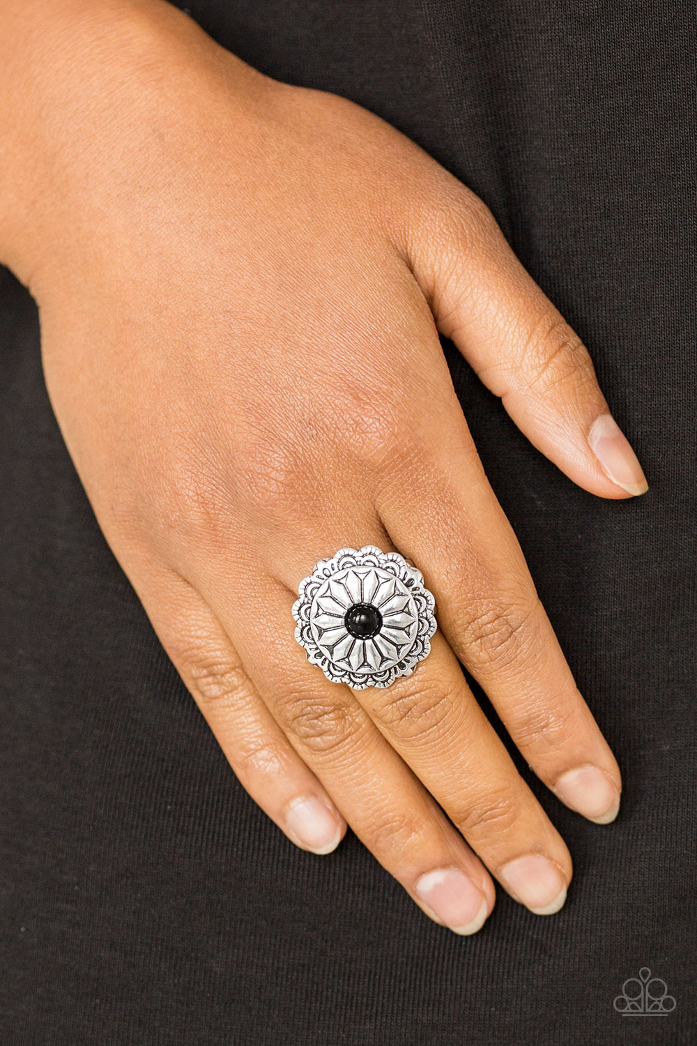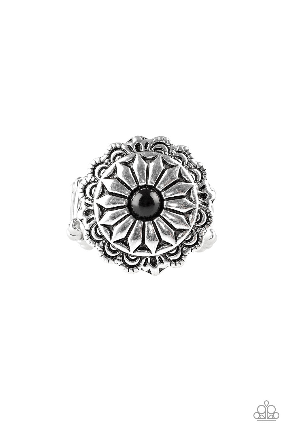 A shiny black bead is pressed into a glistening silver frame radiating into a floral detail for a seasonal look. Features a stretchy band for a flexible fit.