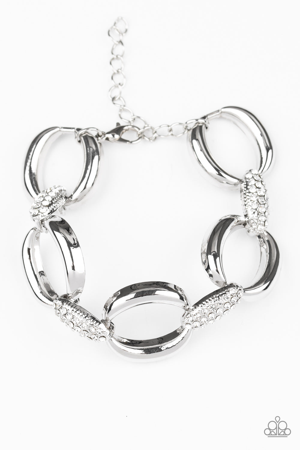 Bold silver links join with white rhinestone encrusted frames around the wrist for a fierce look. Features an adjustable clasp closure.
