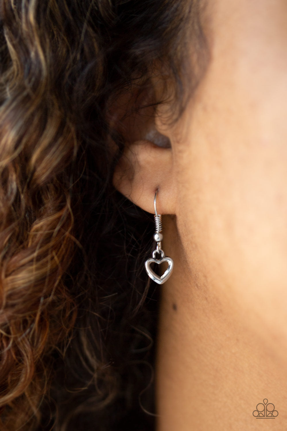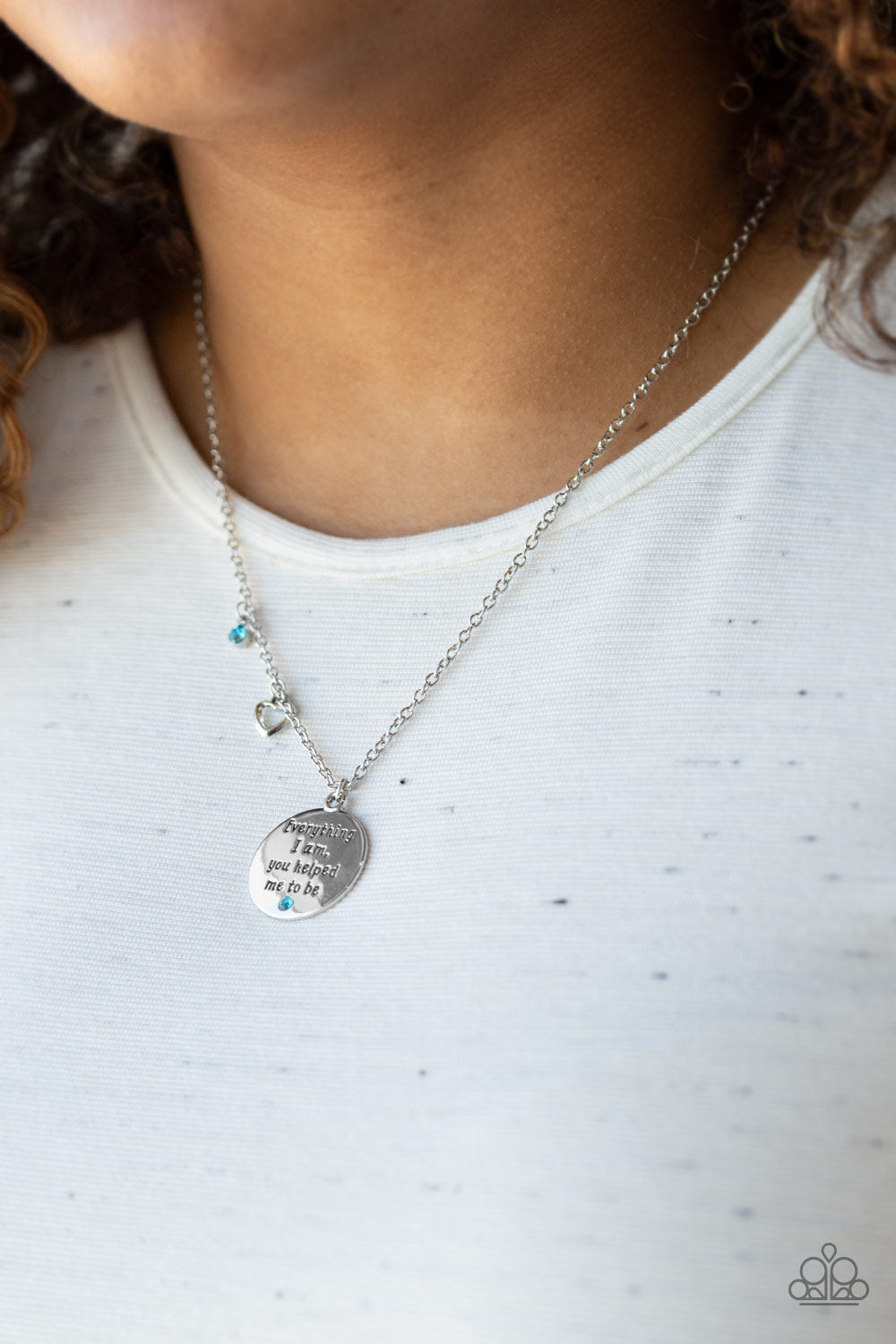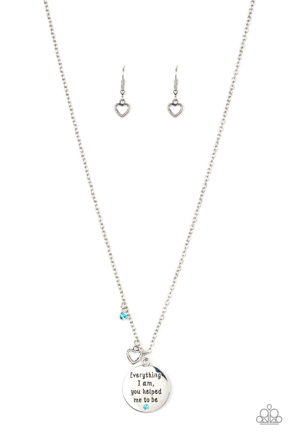 A solitaire blue rhinestone, dainty silver heart, and a shimmery silver disc stamped with the inspirational phrase, "Everything I am, you helped me be", swings below the collar for a whimsical look. Features an adjustable clasp closure.