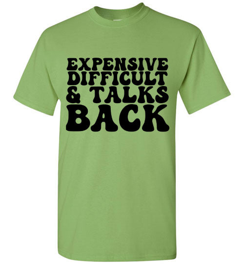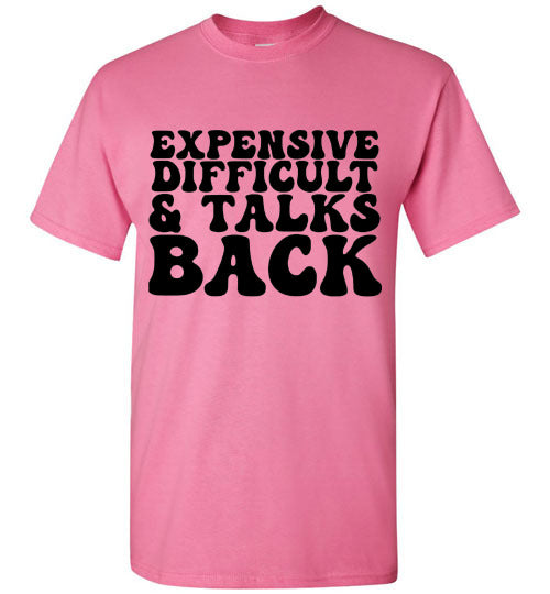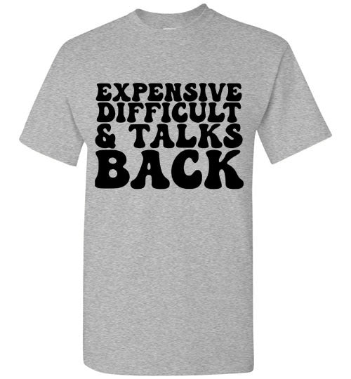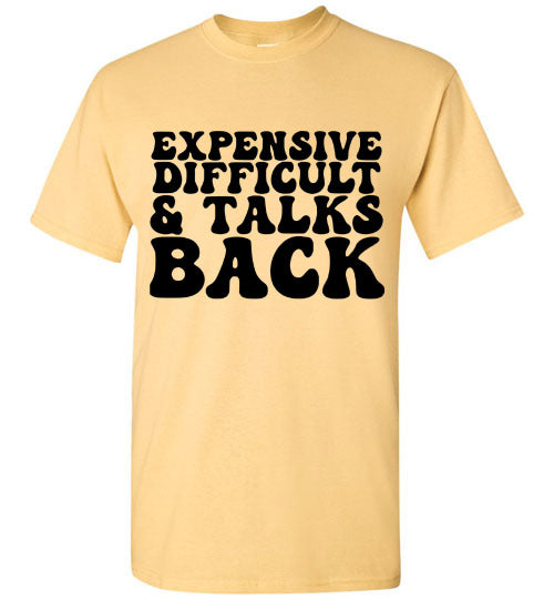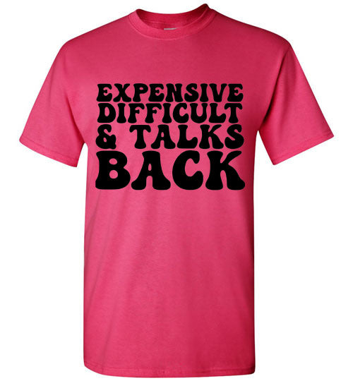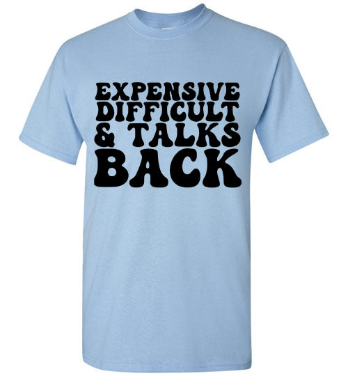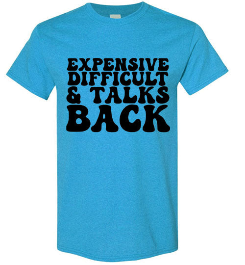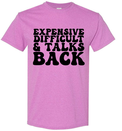 This Expensive Difficult & Talks Back Graphic Tee Shirt Top is sure to get attention for its unique and funny design. Featuring a premium fabric and intricate design, this top is sure to make a statement.