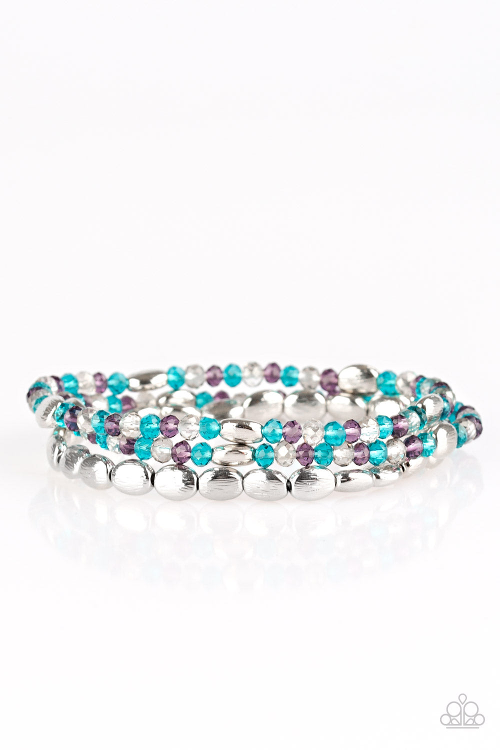Infused with hints of silver, dainty blue, white, and purple crystal-like beads are threaded along stretchy bands, creating whimsical layers across the wrist.