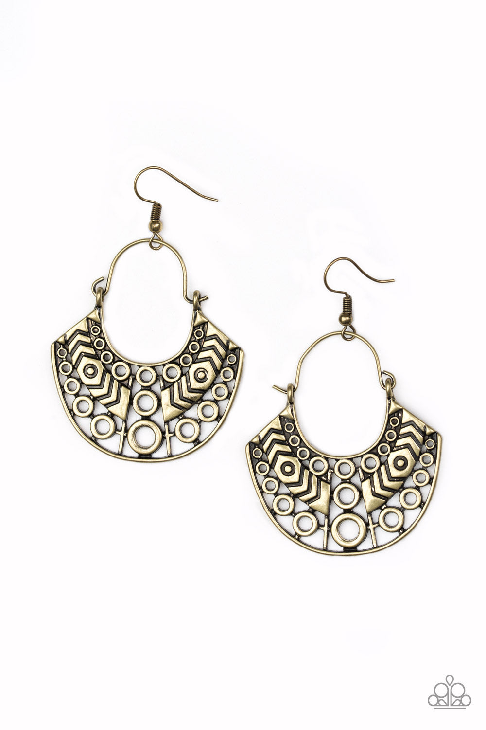 Radiating in circular detail, a bold brass crescent frame attaches to a rounded wire fitting for an indigenous look. Earring attaches to a standard fishhook fitting.