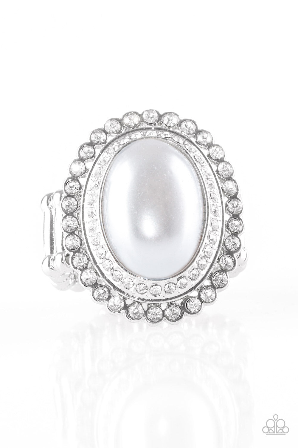 A pearly silver bead adorns the center of stacked silver frames encrusted in glassy white rhinestones for a dramatically refined look. Features a stretchy band for a flexible fit.