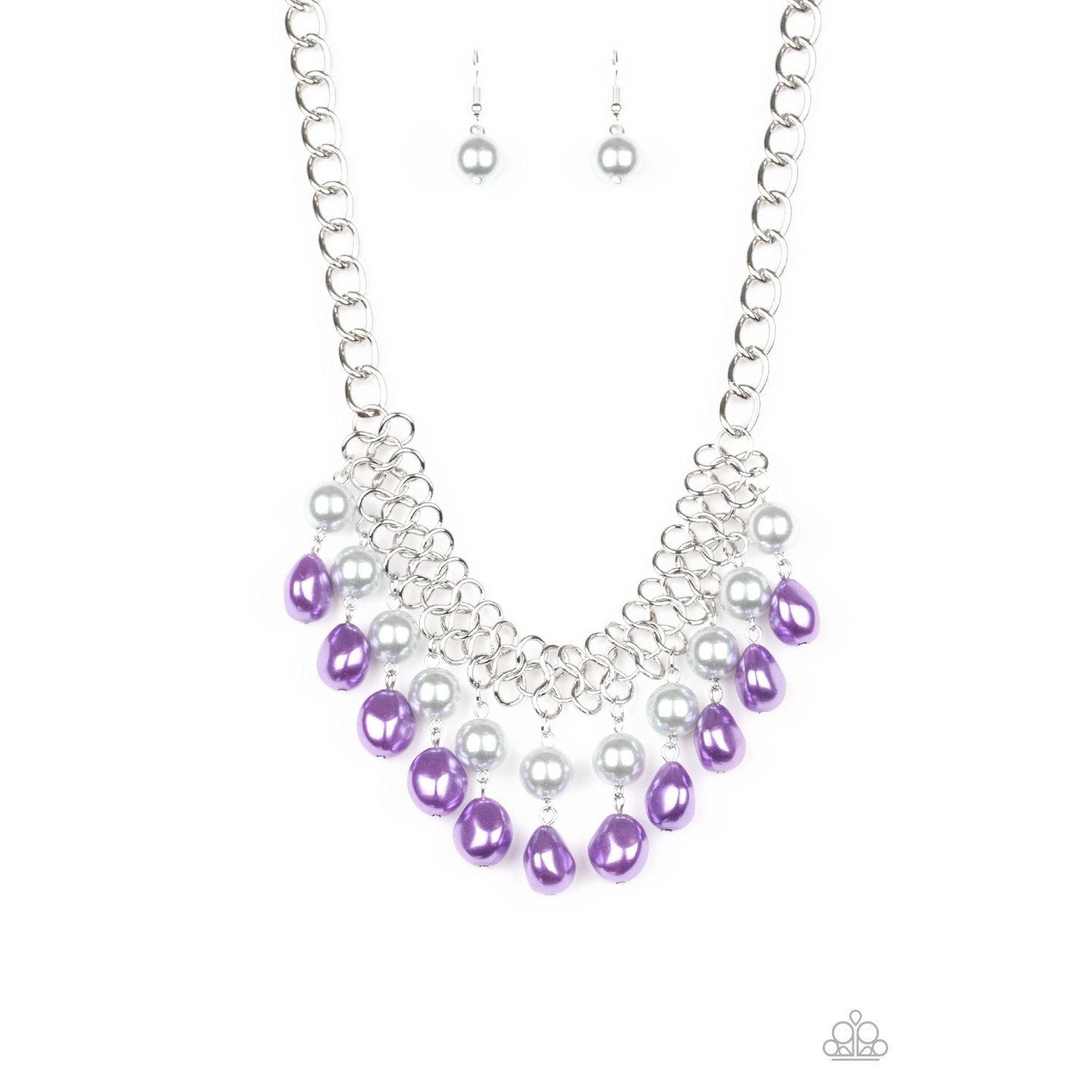 A collection of classic and imperfect silver and purple pearls dangle from a web of interlocking silver links below the collar, adding a modern twist to the timeless palette. Features an adjustable clasp closure.