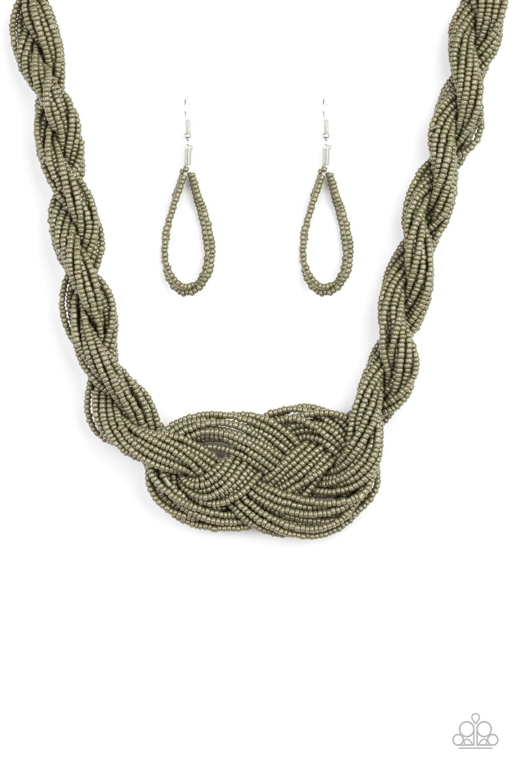 Countless strands of Martini Olive seed beads are twisted and knotted together to create an unforgettable statement piece. Features an adjustable clasp closure.