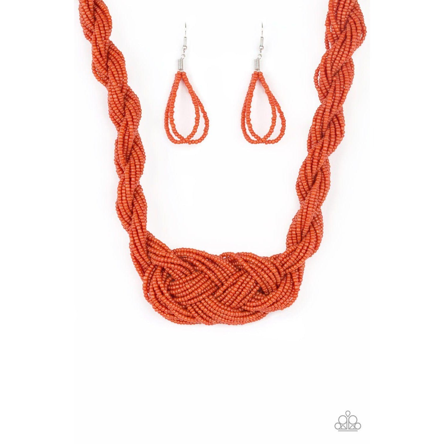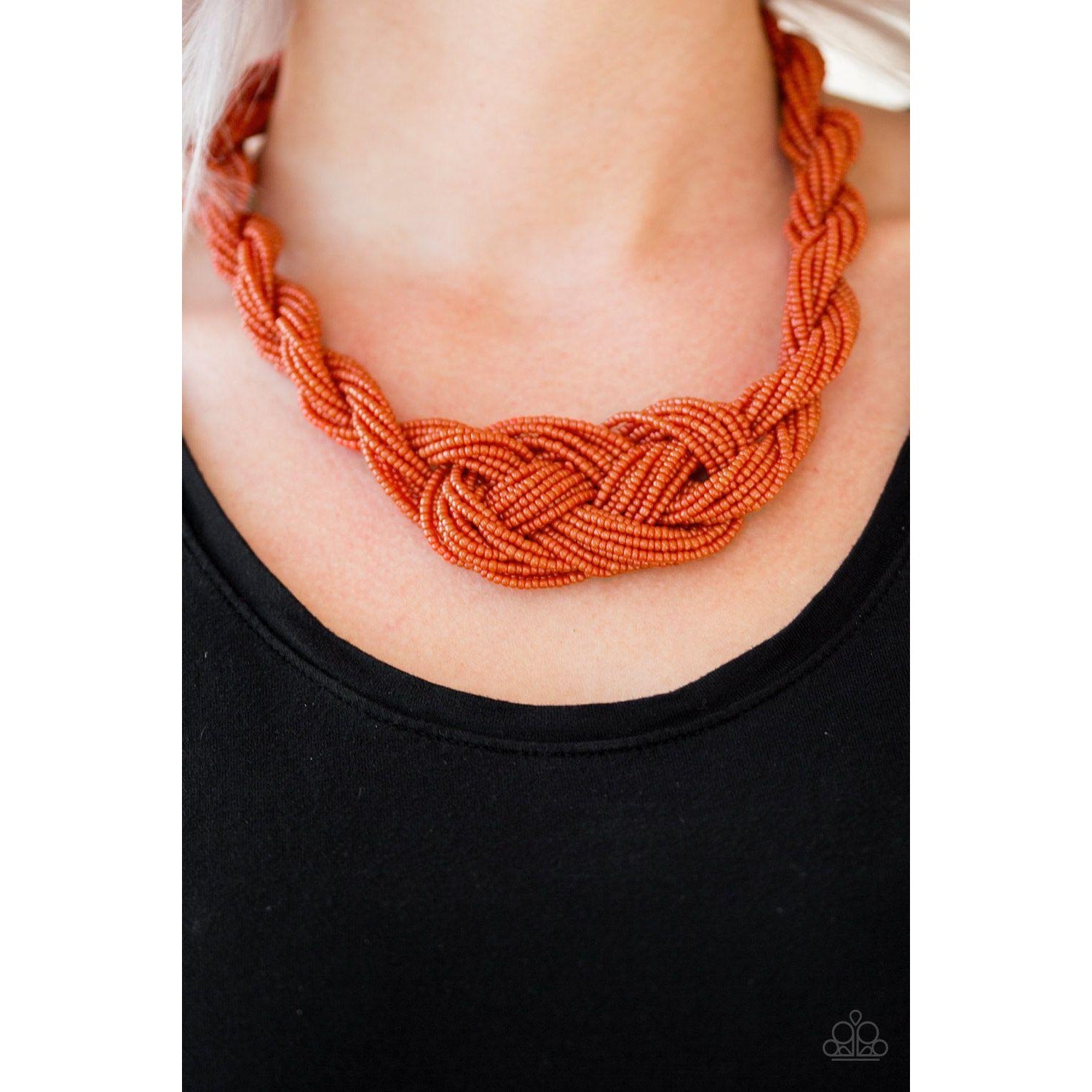 Countless strands of burnt orange seed beads are twisted and knotted together to create an unforgettable statement piece. Features an adjustable clasp closure.