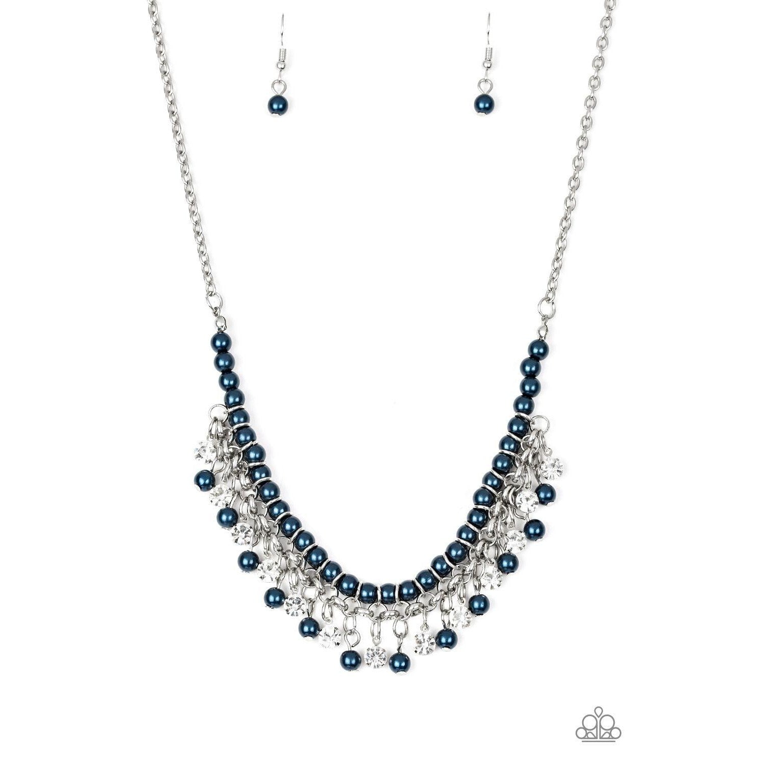 Infused with silver chain, blue pearls are threaded along an invisible wire below the collar. Matching blue pearls and glittery white rhinestones swing from the pearly strand, creating a flirtatious fringe below the collar. Features an adjustable clasp closure.