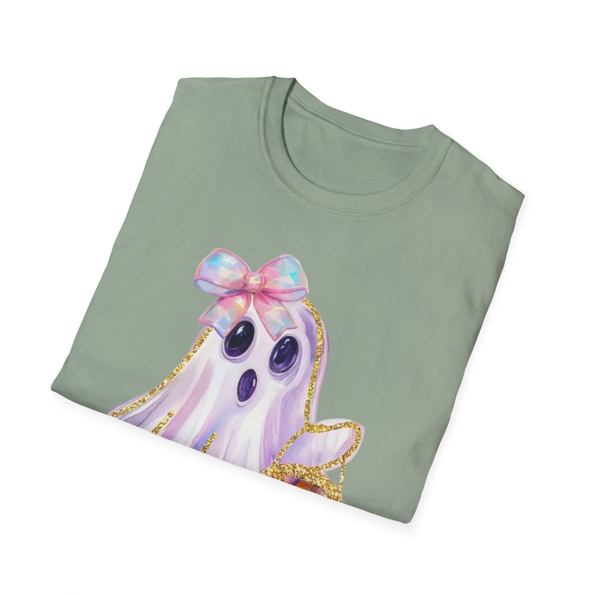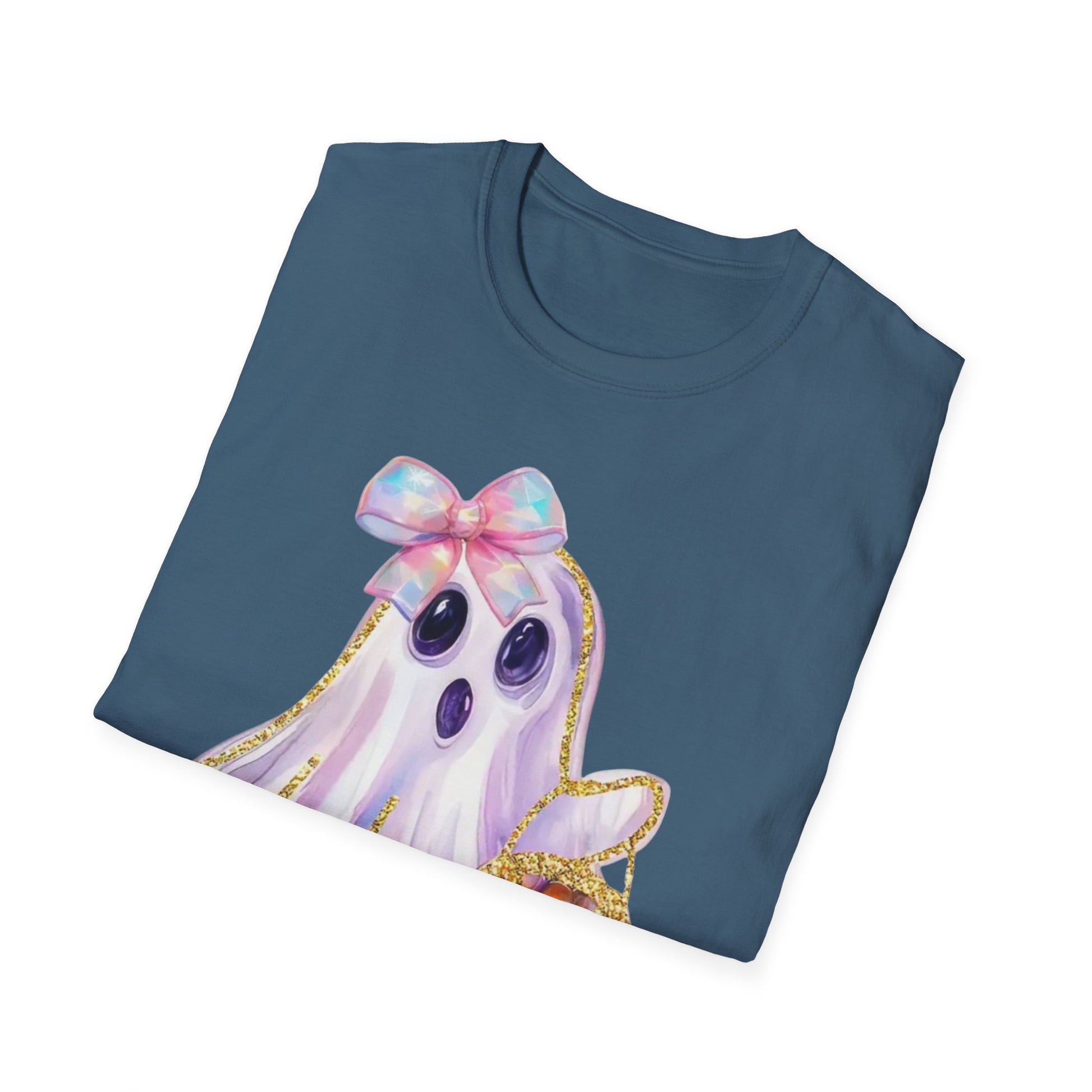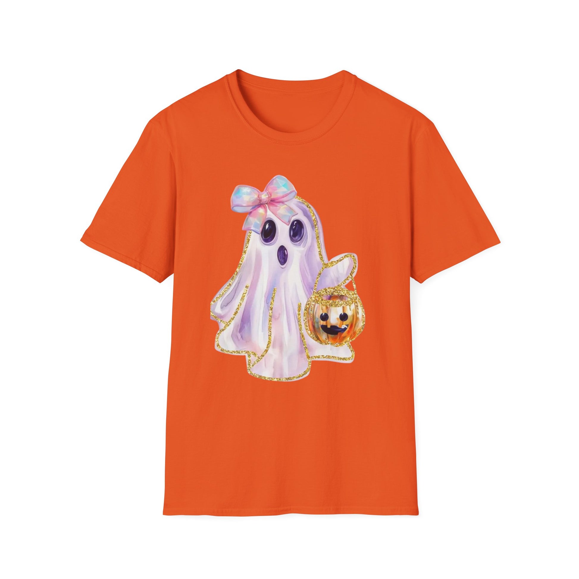 Embrace the whimsical spirit of Halloween with this adorable unisex softstyle t-shirt. Featuring a charming design of a friendly ghost with a festive pumpkin, this shirt brings a playful touch to your wardrobe. It's perfect for casual outings, Halloween parties, or cozy nights in. The lightweight, breathable fabric ensures comfort all year round, making it a delightful addition to any outfit. Ideal for anyone who loves whimsical designs, this t-shirt is a must-have for children and adults alike, celebrating moments of fun and festivity. Whether you're gifting a friend or treating yourself, this shirt is the perfect way to get in the Halloween spirit!