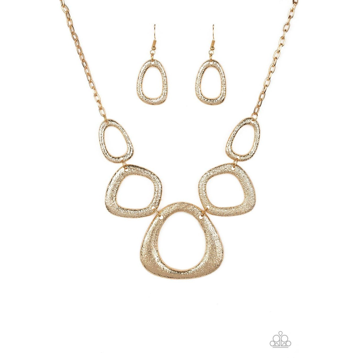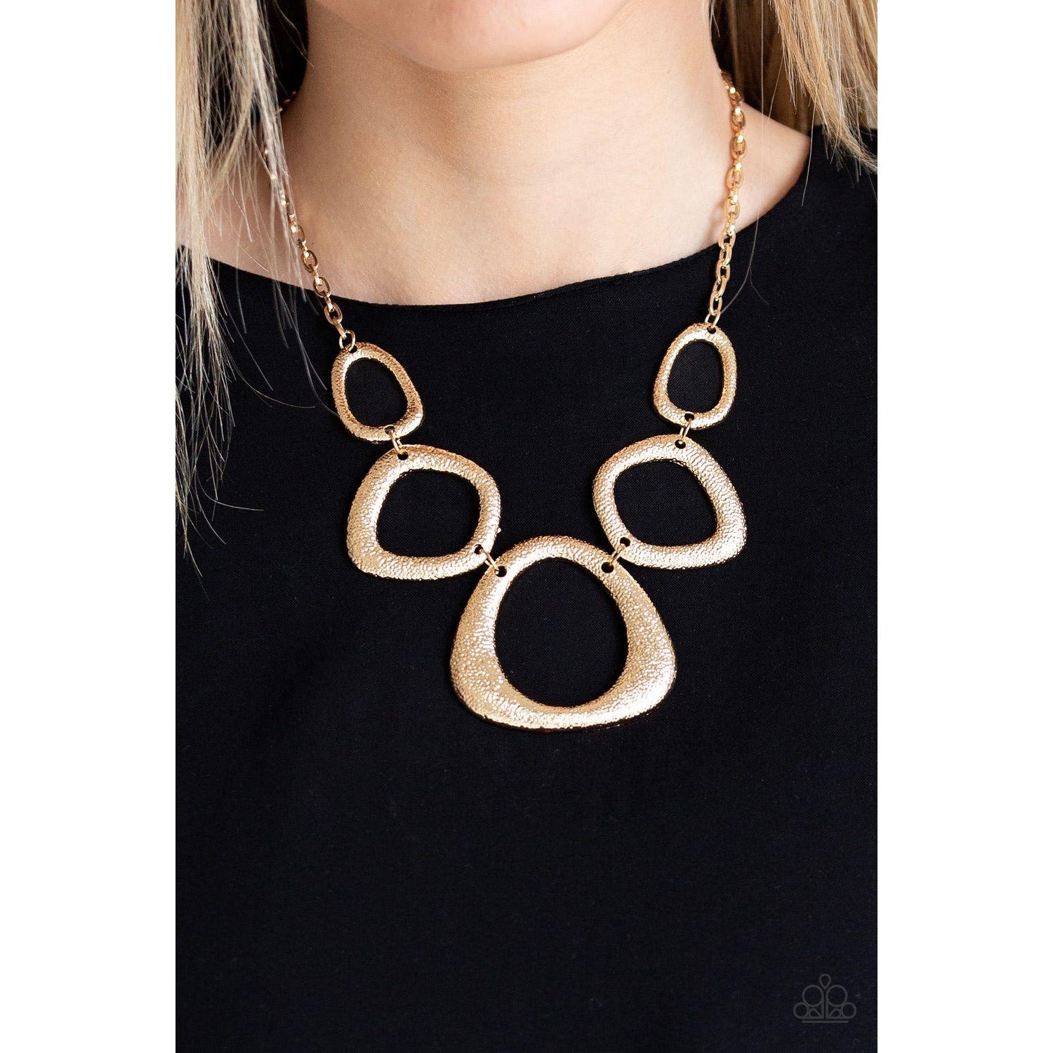Hammered in a high-sheen finish, asymmetrical gold frames link below the collar in an edgy statement-making fashion. Features an adjustable clasp closure.