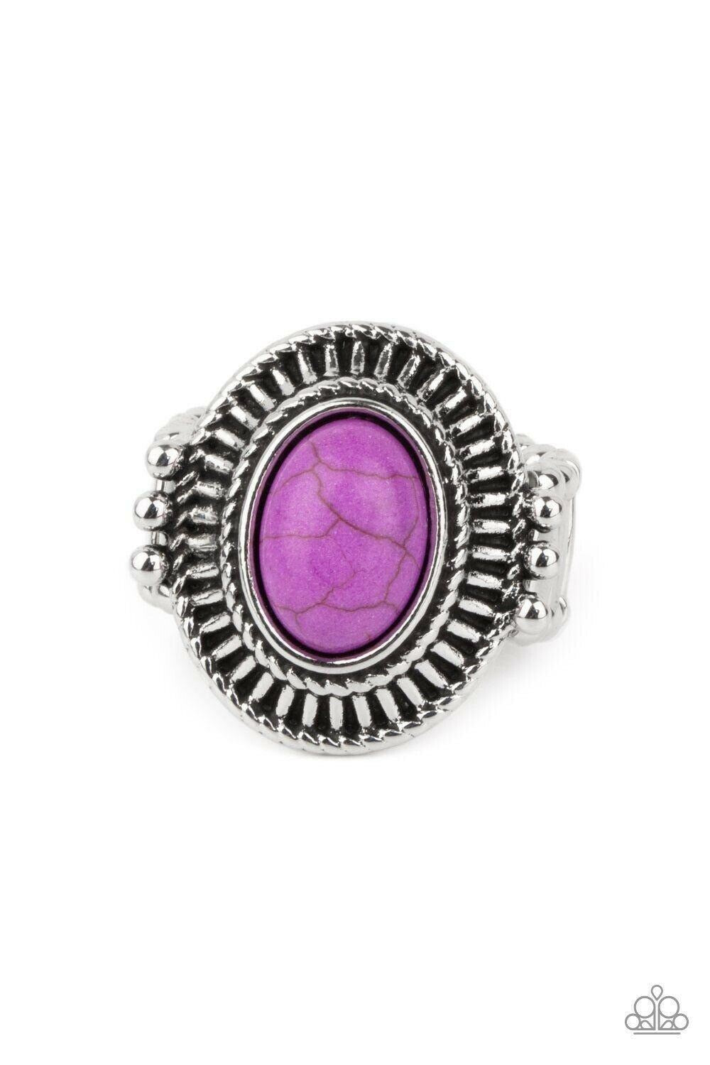 An oval purple stone is pressed into the center of an antiqued silver frame radiating with striking linear texture. The colorful centerpiece is held in place with faux-pronged silver studs, creating a bold tribal-inspired statement. Features a stretchy band for a flexible fit.