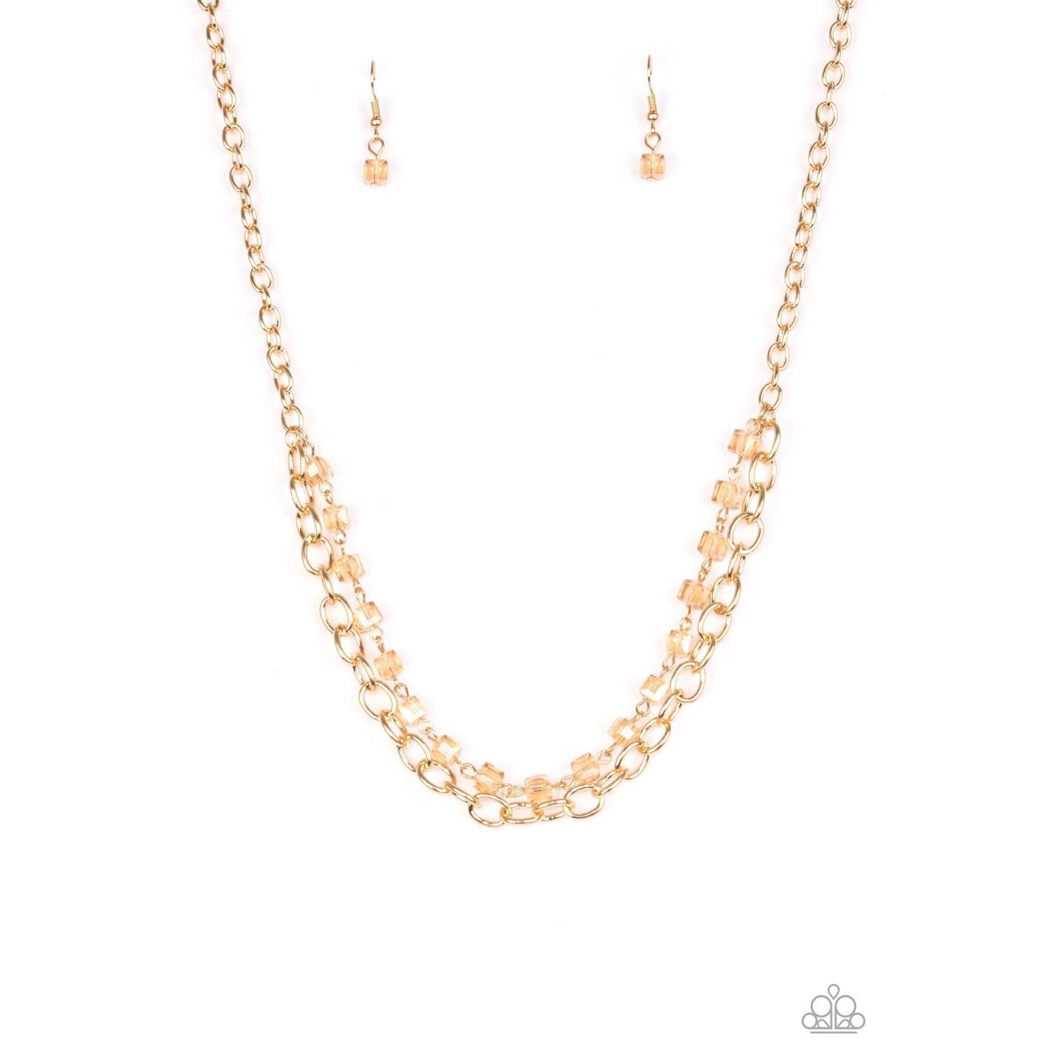 A strand of golden crystal-like cube beading joins a classic strand of gold chain below the collar, creating refined layers. Features an adjustable clasp closure.