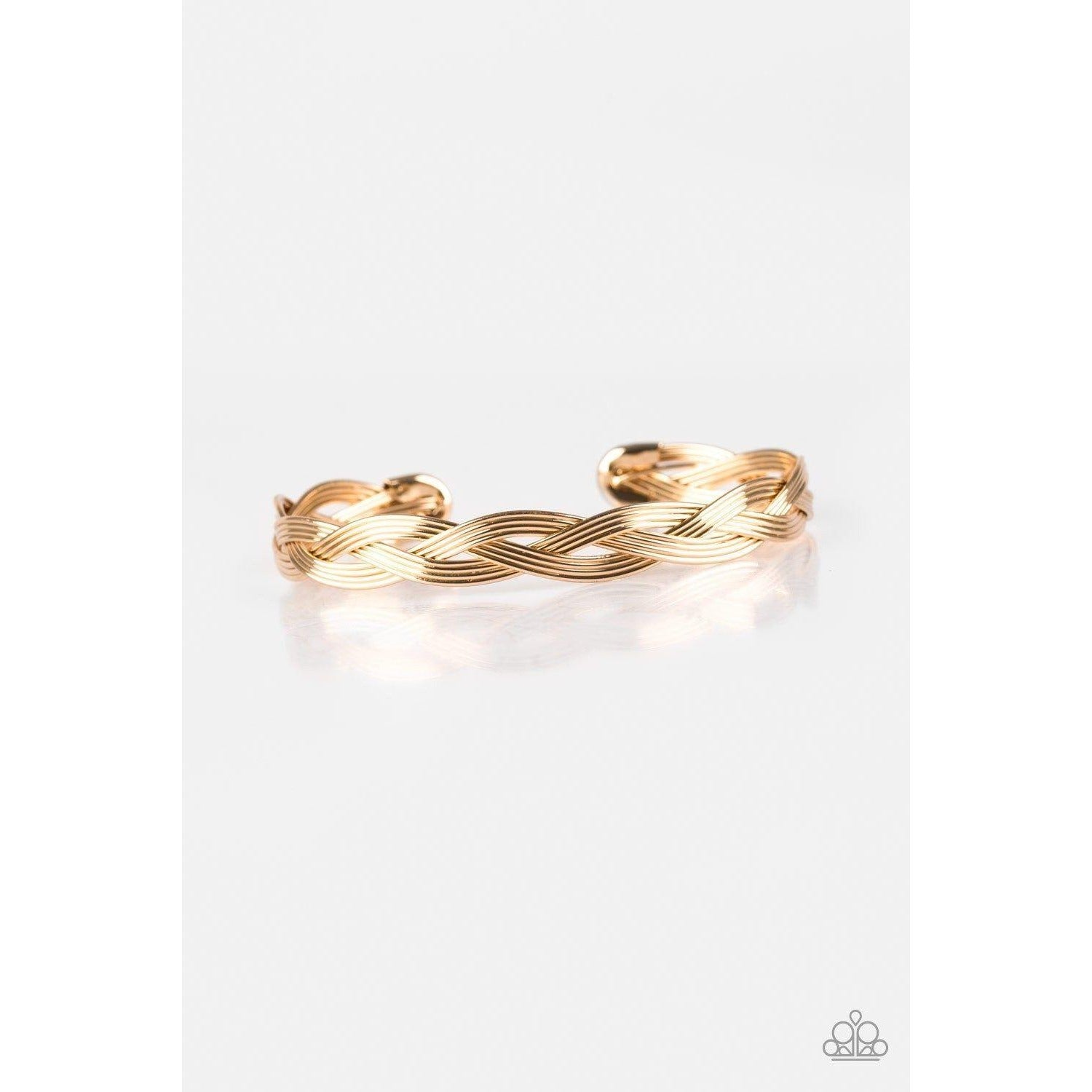 Glistening gold wires braid across the wrist, coalescing into a dainty cuff.