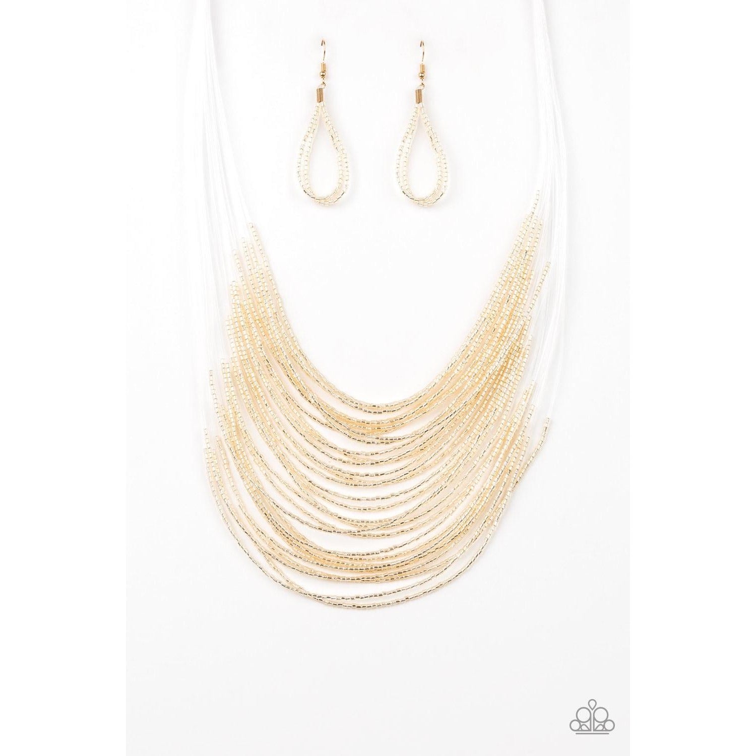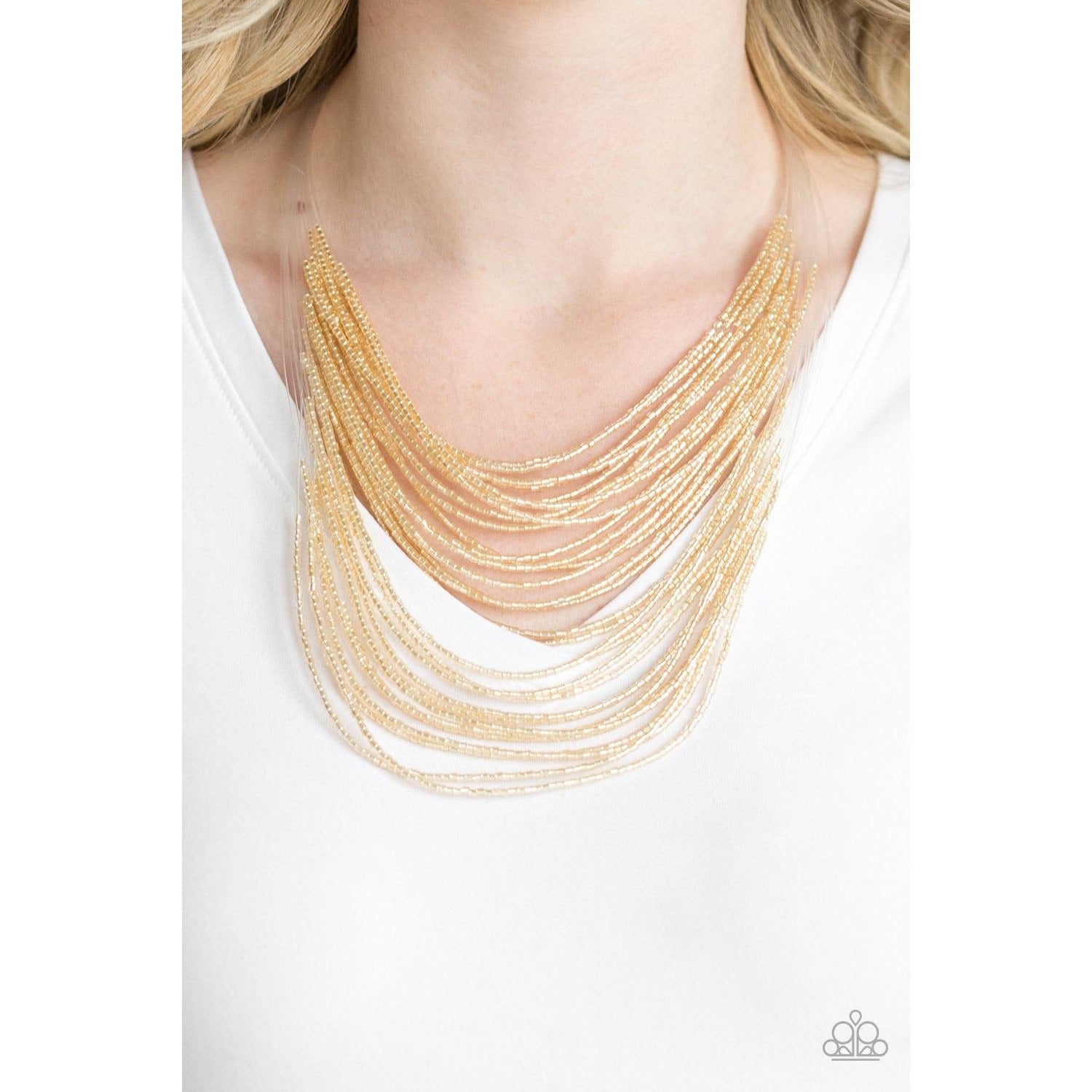 Strand after strand of metallic gold seed beads fall together to create a bold statement piece. Features an adjustable clasp closure.