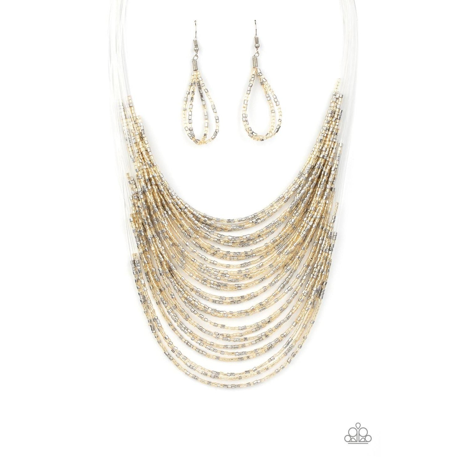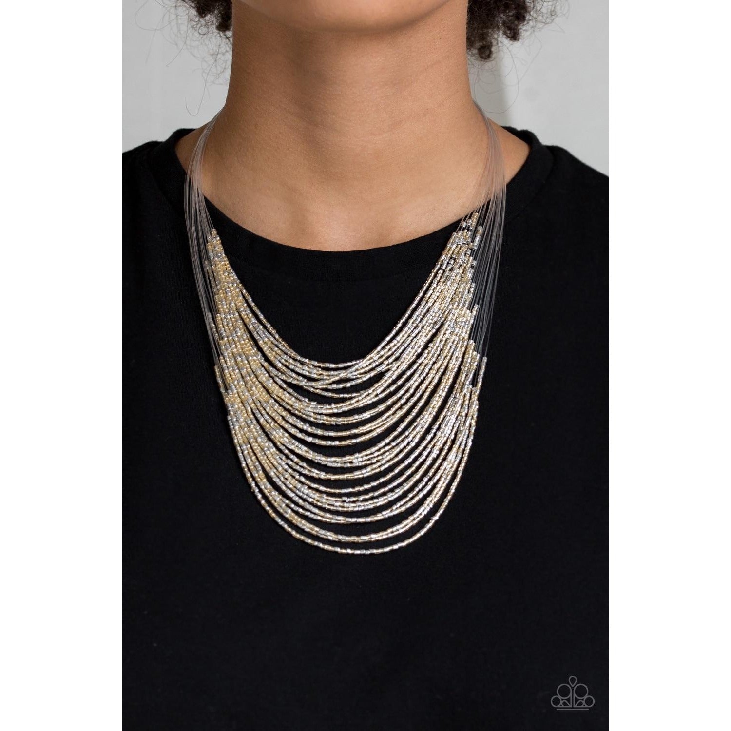 Strand after strand of metallic gold and silver seed beads fall together to create a bold statement piece. Features an adjustable clasp closure.