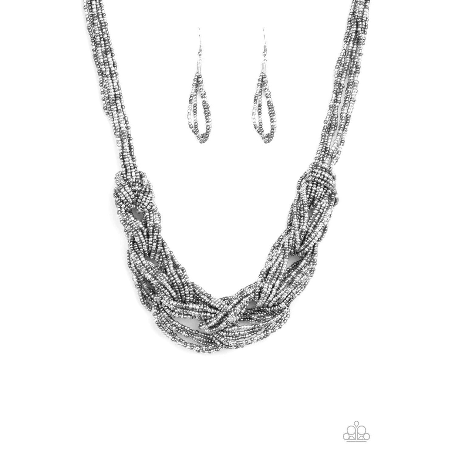 Brushed in a flashy finish, countless strands of silver and gunmetal seed beads weave into a bulky square braid below the collar for a glamorous look. Features an adjustable clasp closure.