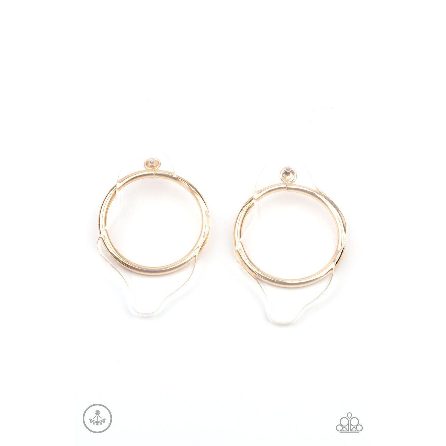 An asymmetrical piece of clear acrylic overlaps a glistening gold hoop, creating a bold display. Earring attaches to a standard post fitting.