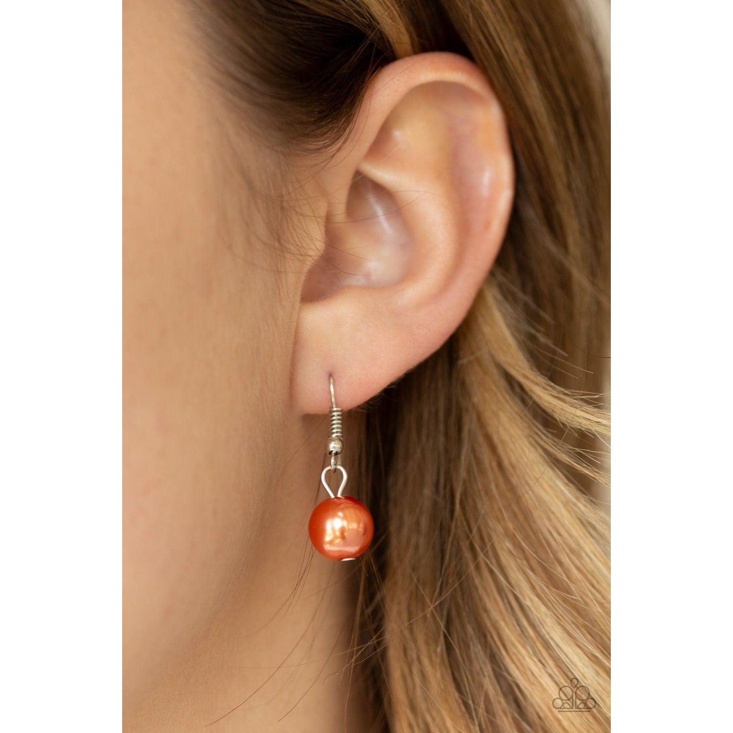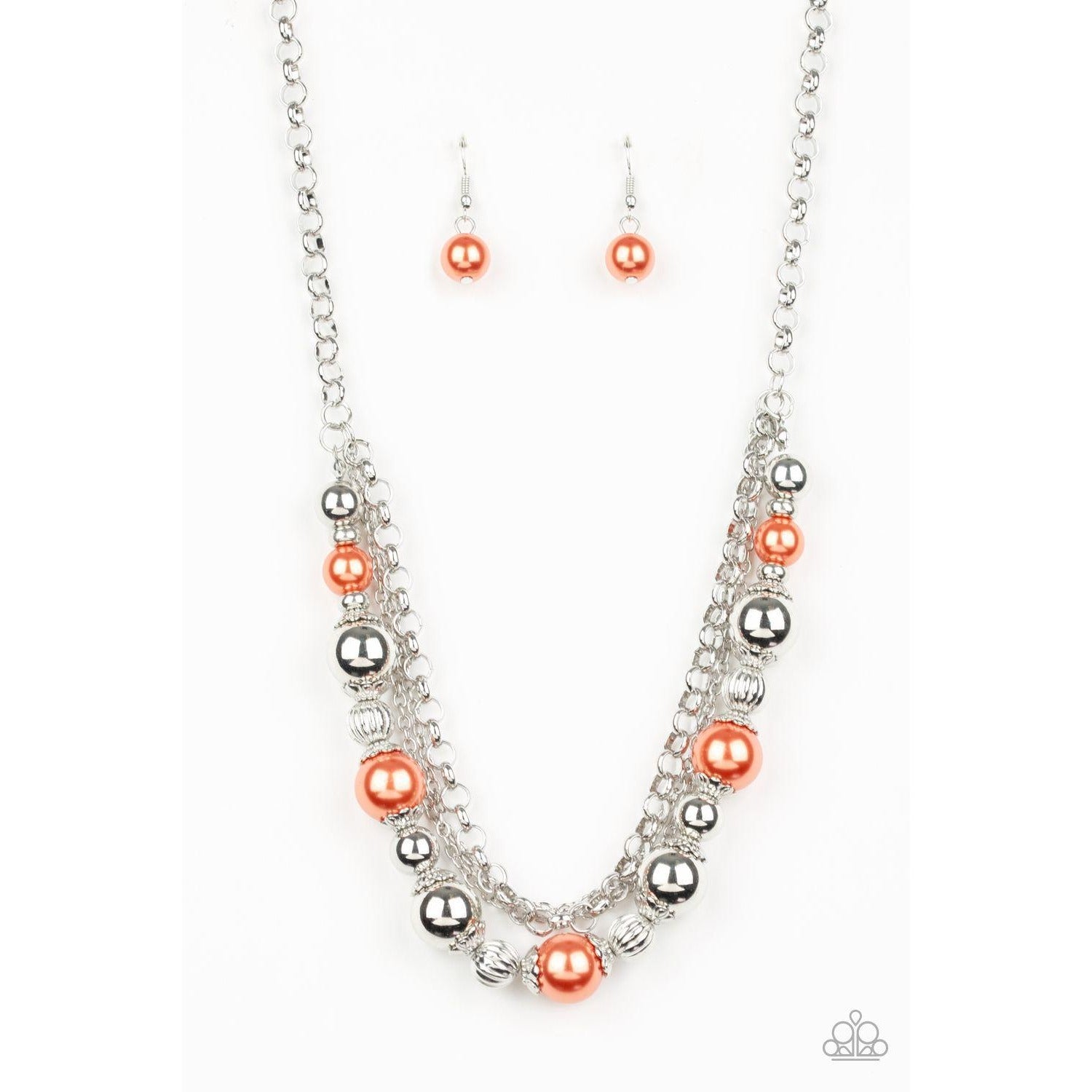 Layers of mismatched silver chains give way to a strand of ornate silver beads and oversized orange pearls that cascade below the collar for a refined flair. Features an adjustable clasp closure.