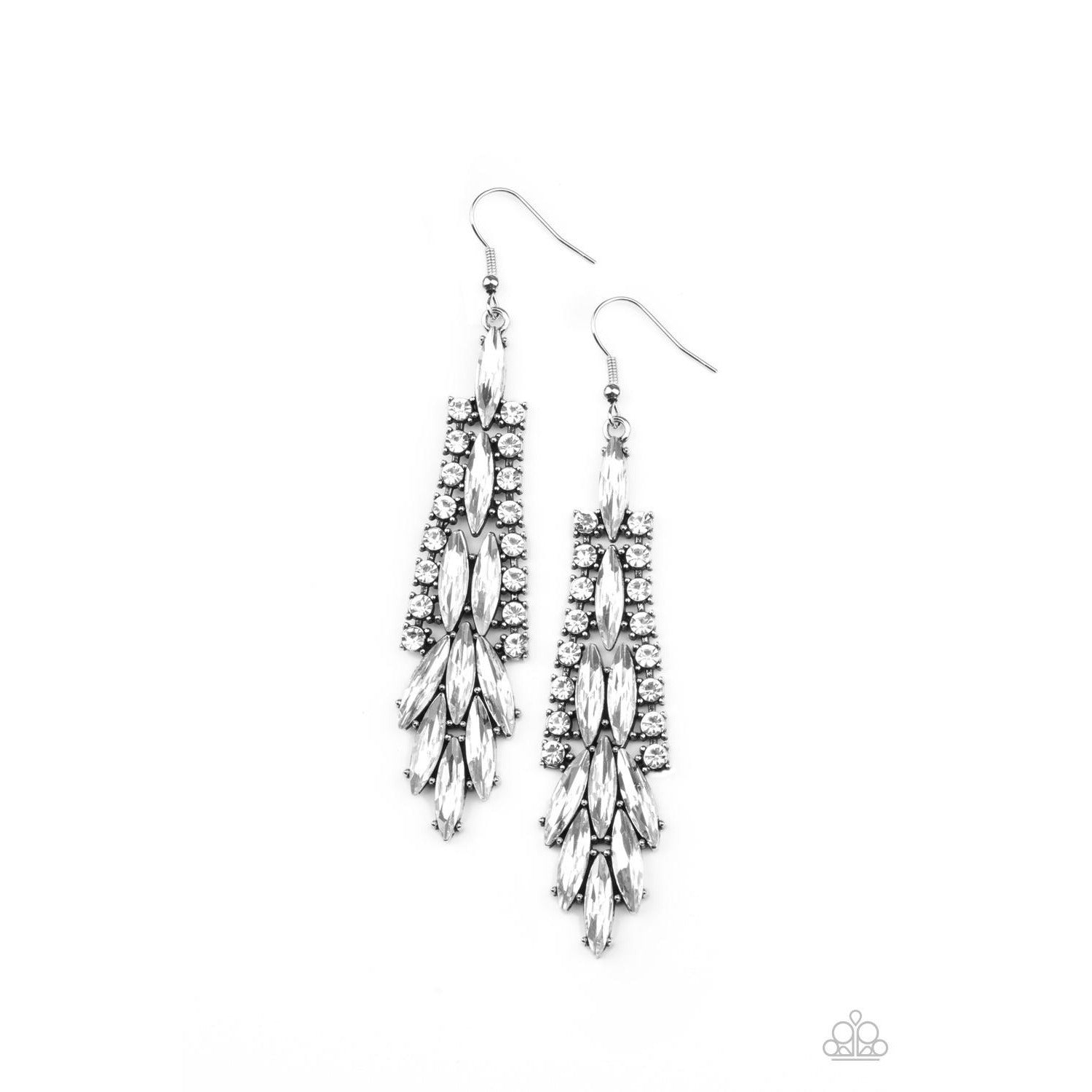 Glassy white marquise cut rhinestones cascade from the center of a silver frame bordered in ribbons of dainty white rhinestones, creating a glamorous chandelier. Earring attaches to a standard fishhook fitting.