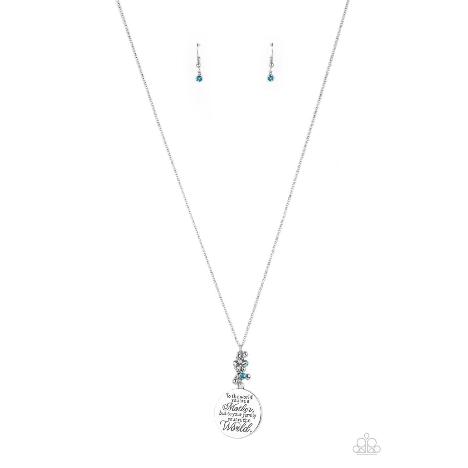 A silver disc inscribed with the phrase, "To the world you are a Mother, but to your family you are the World," creates a sweet reminder as it falls from a lengthened silver chain. A sprinkle of dainty aquamarine rhinestones and silver beads adds a decorative fringe atop the memento. Features an adjustable clasp closure.