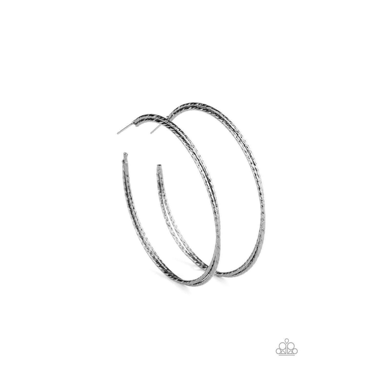 Featuring diamond-cut shimmer, two glistening gunmetal wires delicately twist into an oversized hoop. Earring attaches to a standard post fitting. Hoop measures approximately 2 3/4″ in diameter.