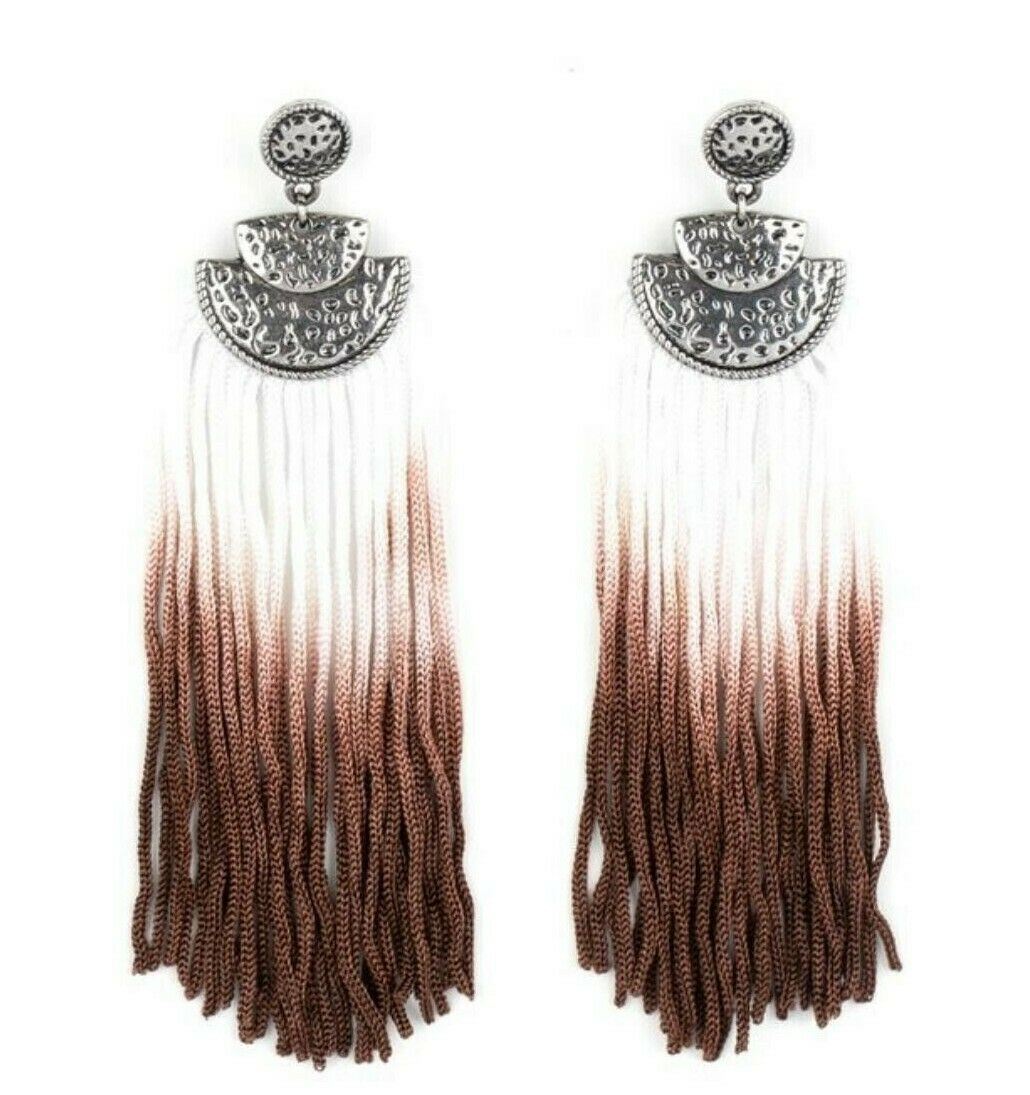 Gradually fading from white to brown, shiny cording streams from the bottom of hammered silver frames, creating a colorful fringe. Earring attaches to a standard post fitting.