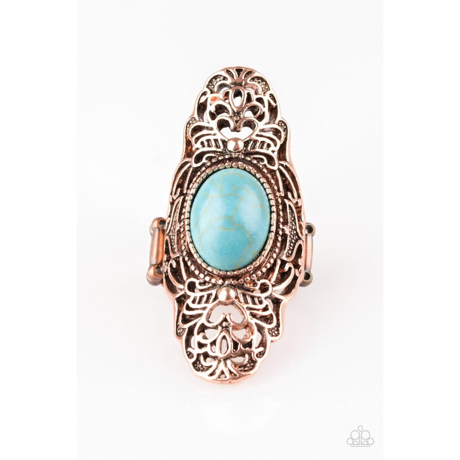 Dotted with a refreshing turquoise stone center, glistening copper filigree climbs the finger, coalescing into a dramatic frame. Features a stretchy band for a flexible fit.