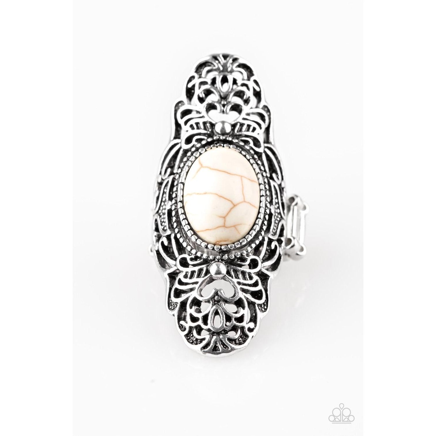 Dotted with an earthy white stone center, glistening silver filigree climbs the finger, coalescing into a dramatic frame. Features a stretchy band for a flexible fit.