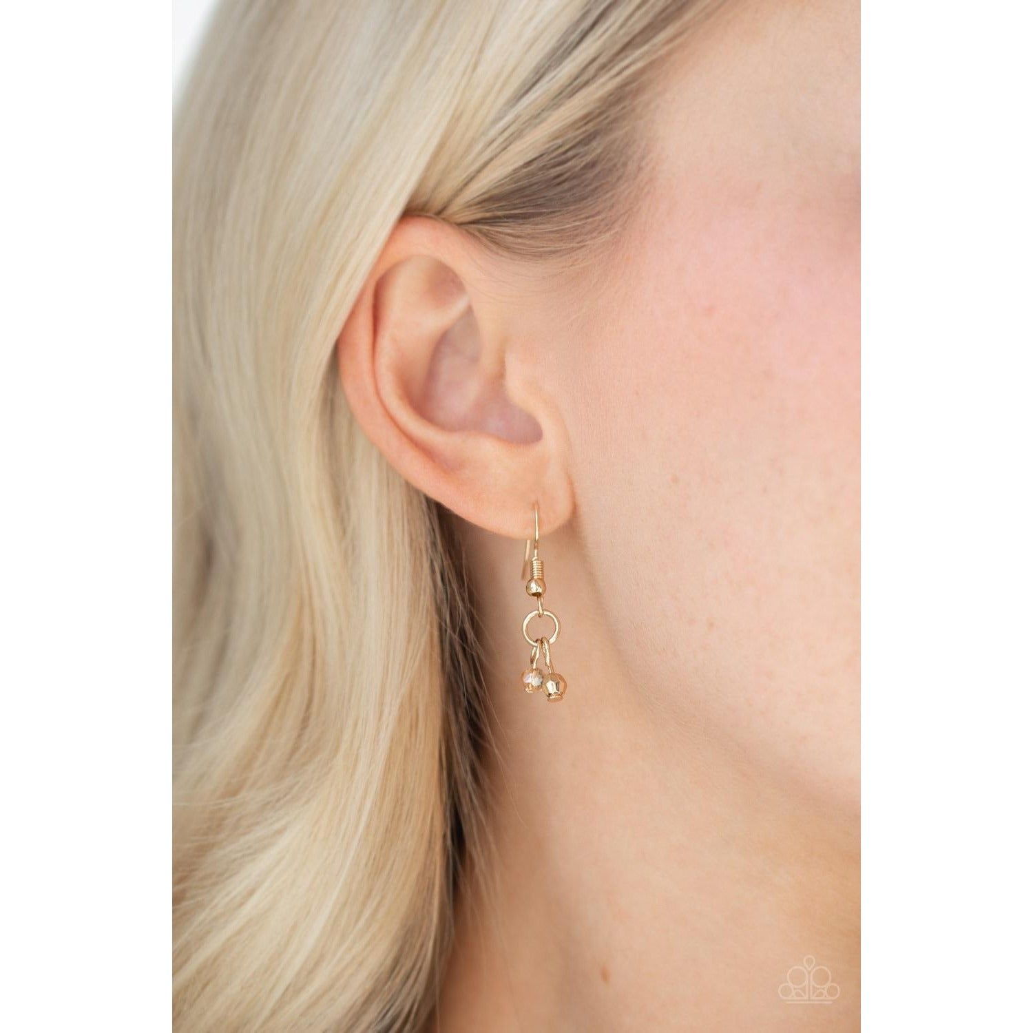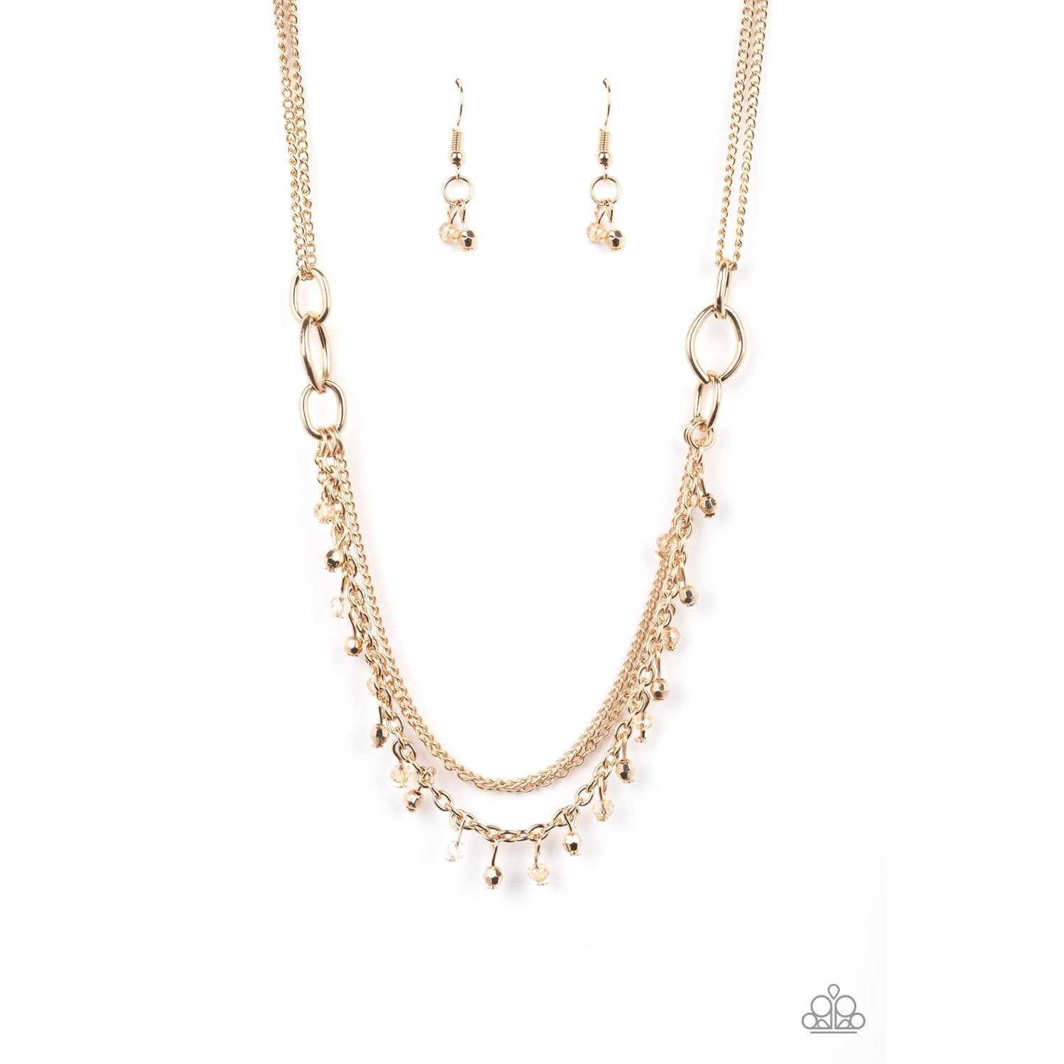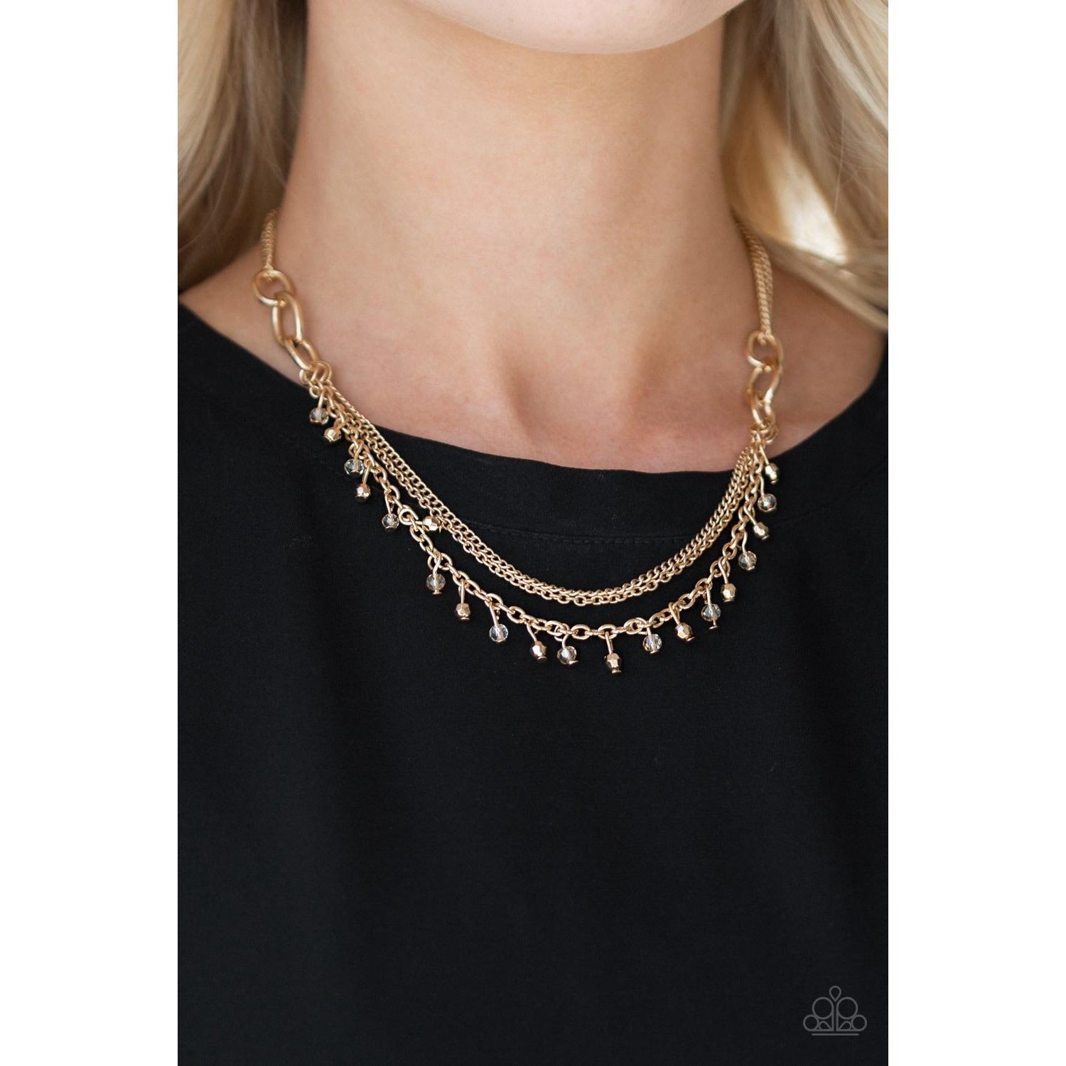 Dainty gold and crystal-like beads cascade from two shimmery gold chains. Infused with plain gold chains, the colorful strands layer below the collar for a flirtatious look. Features an adjustable clasp closure.