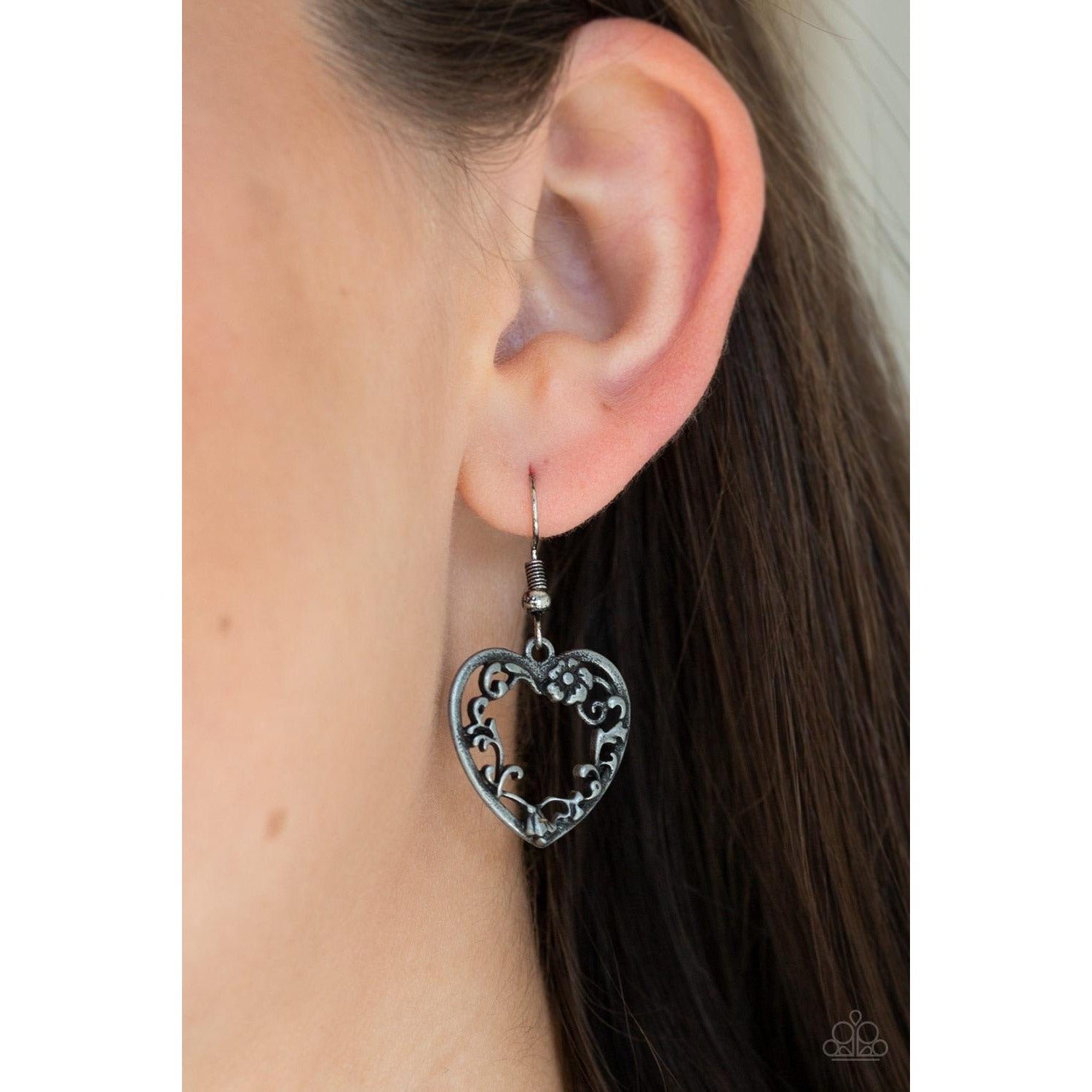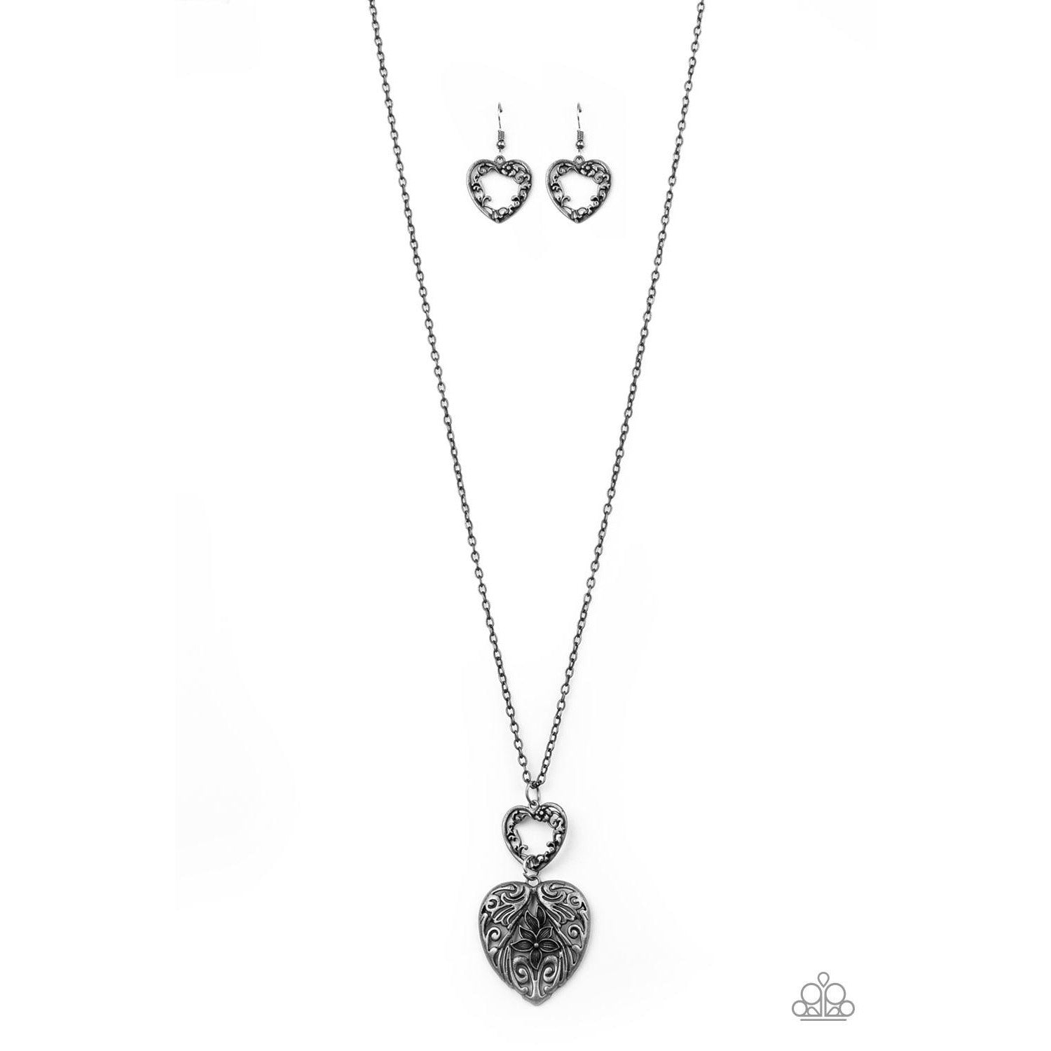 Swirling with ornate floral filigree details, a pair of tin finished silver heart frames link at the bottom of a lengthened silver chain for a vintage inspired look. Features an adjustable clasp closure.