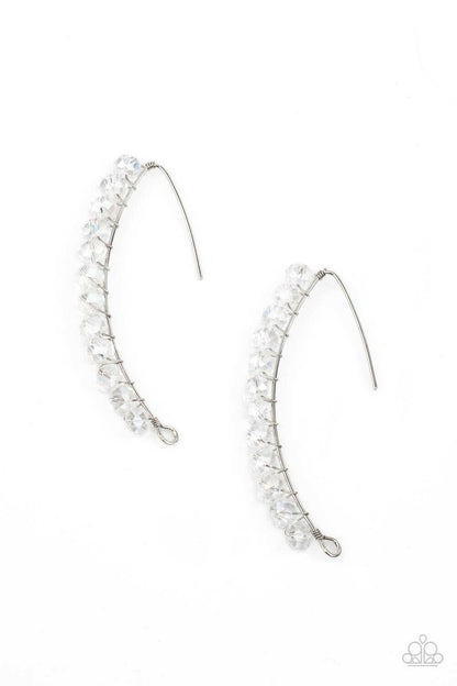 A glittery collection of iridescent white rhinestones are fitted in place along a curved silver wire, creating a glamorous hanging post. Earring attaches to a standard hanging post fitting.
