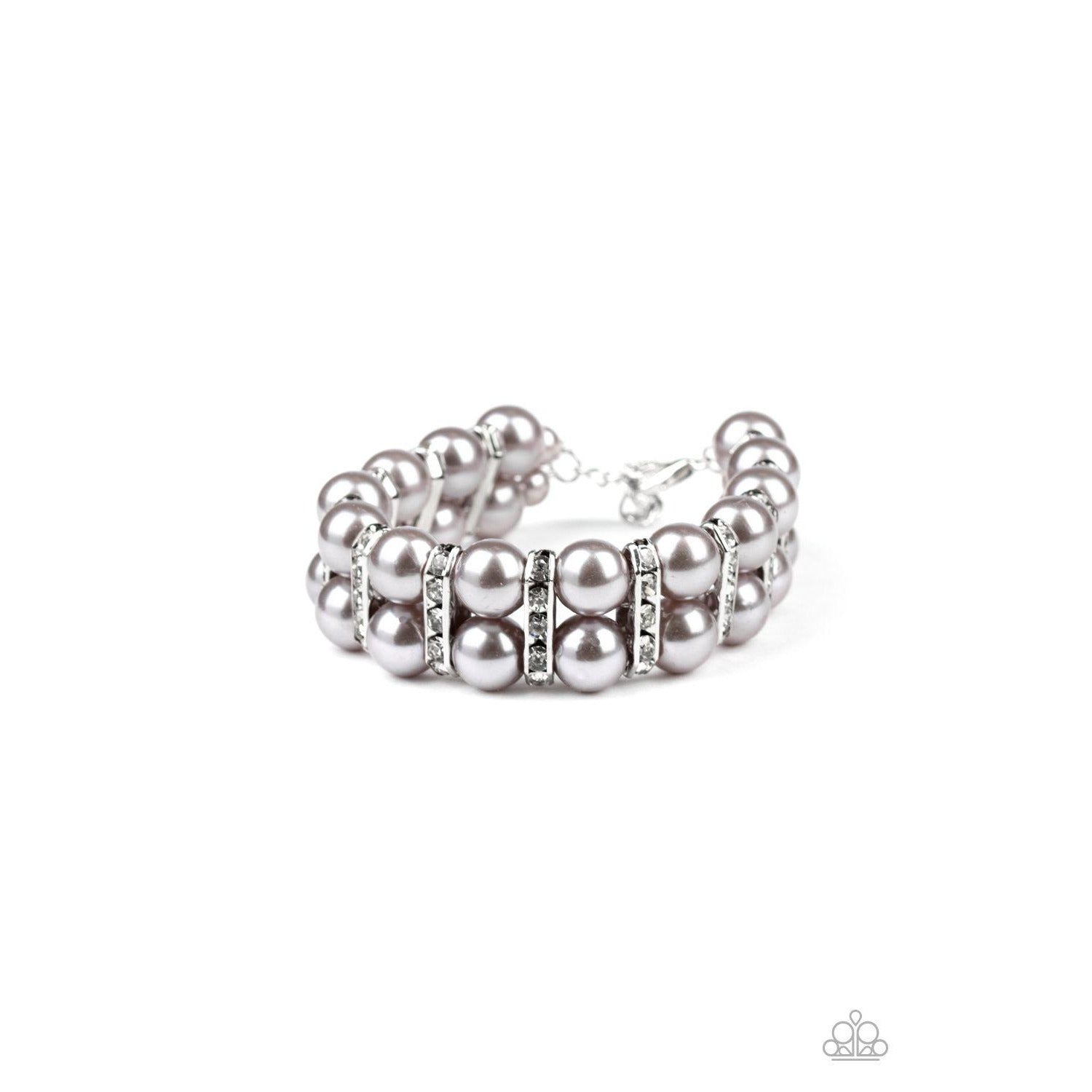 Pairs of pearly silver beads and white rhinestone encrusted silver fittings are threaded along an invisible wire around the wrist for a refined flair. Features an adjustable clasp closure.