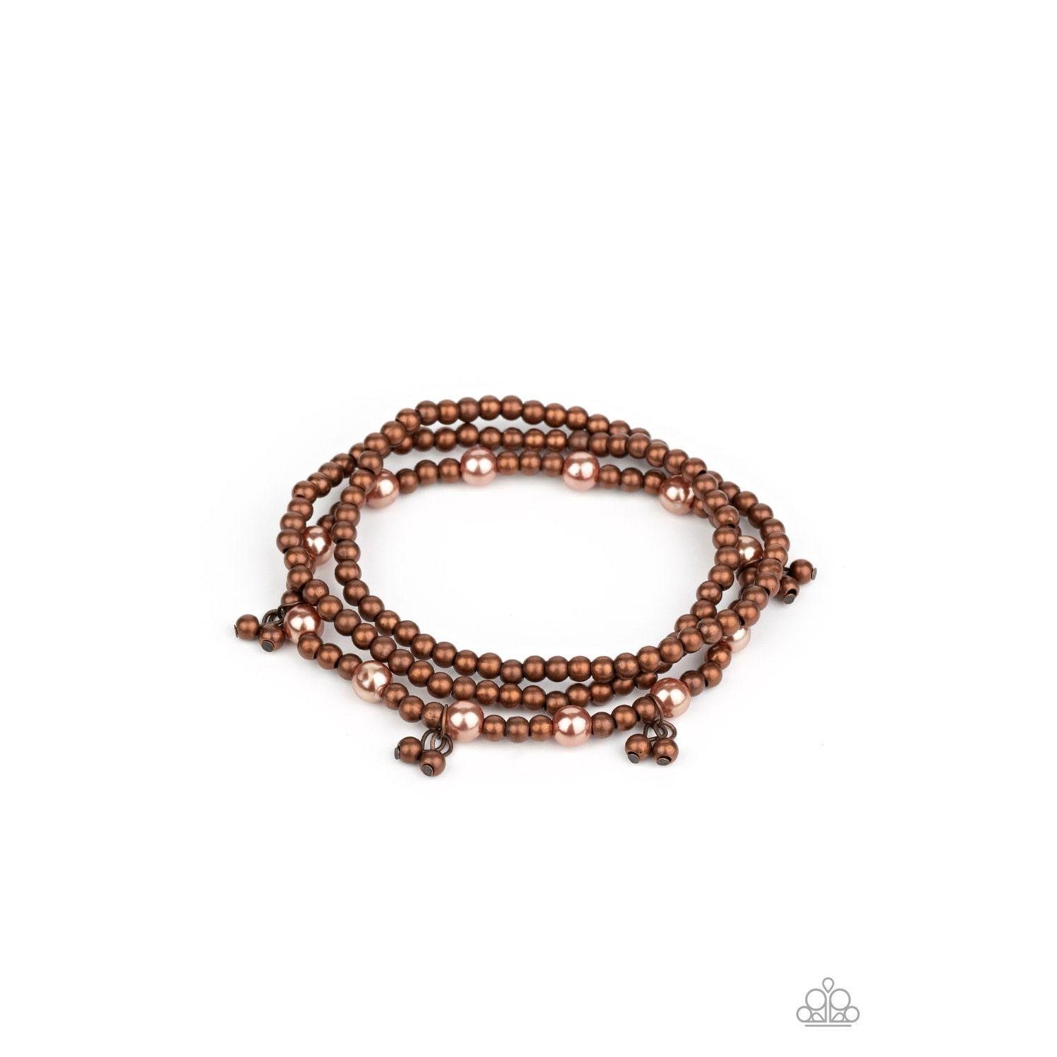 Dainty copper beads are threaded along stretchy bands, creating refined layers across the wrist. Infused with pearly accents, pairs of copper beads swing from the wrist for a glamorous finish.