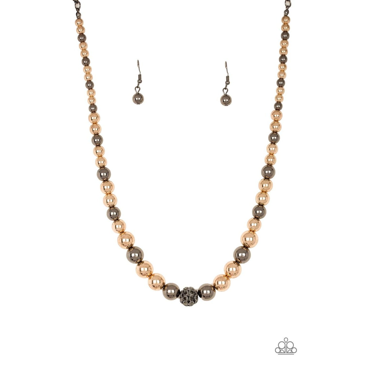 Gradually increasing in size near the center, glistening gold and gunmetal beads are threaded along an invisible wire below the collar. Encrusted in smoky rhinestones, a sparkling gunmetal bead adorns the center for a refined finish. Features an adjustable clasp closure.